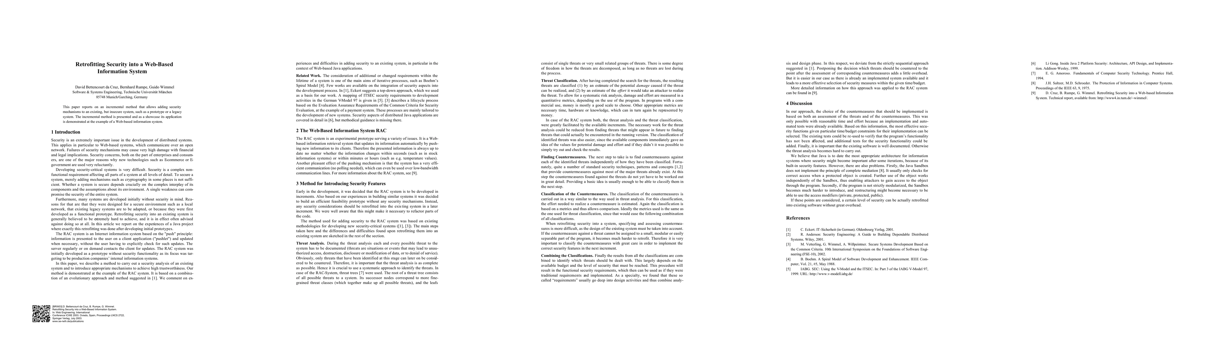 This paper reports on an incremental method that allows adding security mechanisms to an existing, but insecure system, such as a prototype or a legacy system. The incremental method is presented and as a showcase its application is demonstrated at the example of a Web-based information system.