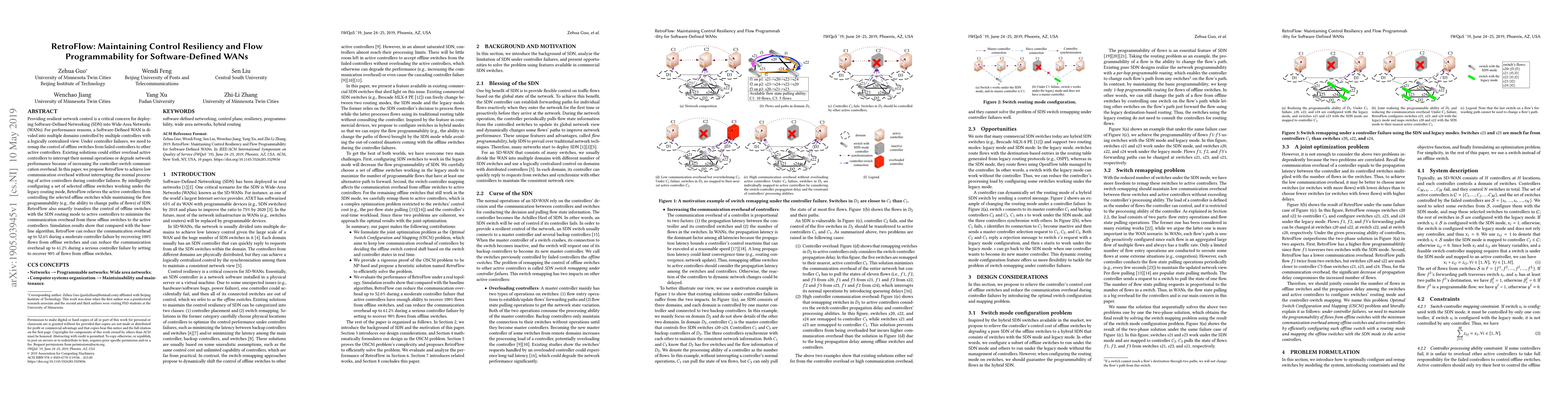 RetroFlow proposes a solution to maintain network control resiliency while minimizing communication overhead in Software-Defined WANs during controller failures.