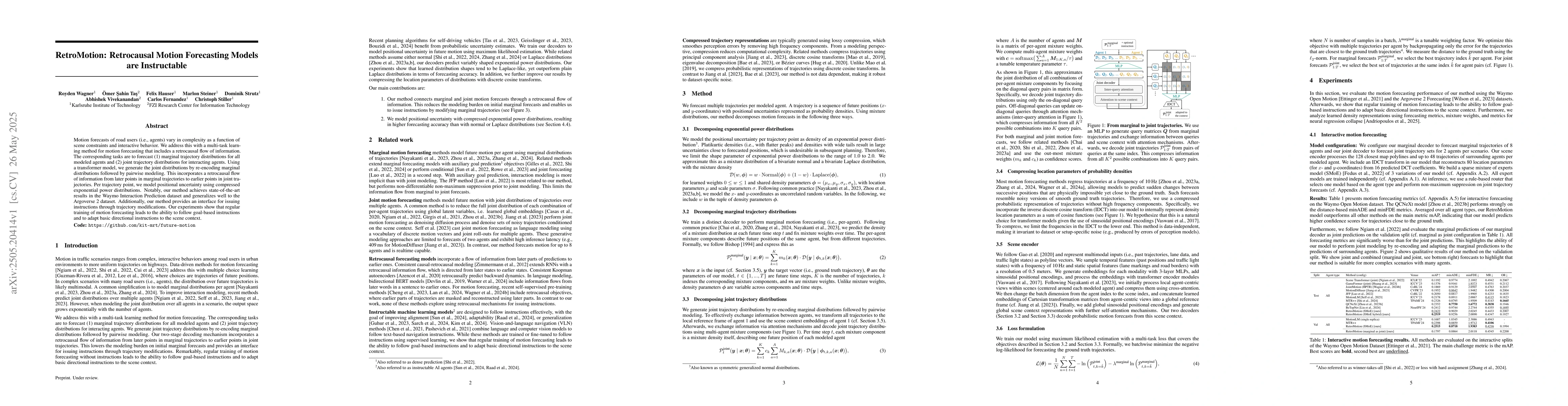 Motion forecasts of road users (i.e., agents) vary in complexity as a function of scene constraints and interactive behavior. We address this with a multi-task learning method for motion forecasting that includes a retrocausal flow of information. The corresponding tasks are to forecast (1) marginal trajectory distributions for all modeled agents and (2) joint trajectory distributions for interacting agents. Using a transformer model, we generate the joint distributions by re-encoding marginal distributions followed by pairwise modeling. This incorporates a retrocausal flow of information from later points in marginal trajectories to earlier points in joint trajectories. Per trajectory point, we model positional uncertainty using compressed exponential power distributions. Notably, our method achieves state-of-the-art results in the Waymo Interaction Prediction dataset and generalizes well to the Argoverse 2 dataset. Additionally, our method provides an interface for issuing instructions through trajectory modifications. Our experiments show that regular training of motion forecasting leads to the ability to follow goal-based instructions and to adapt basic directional instructions to the scene context. Code: https://github.com/kit-mrt/future-motion
