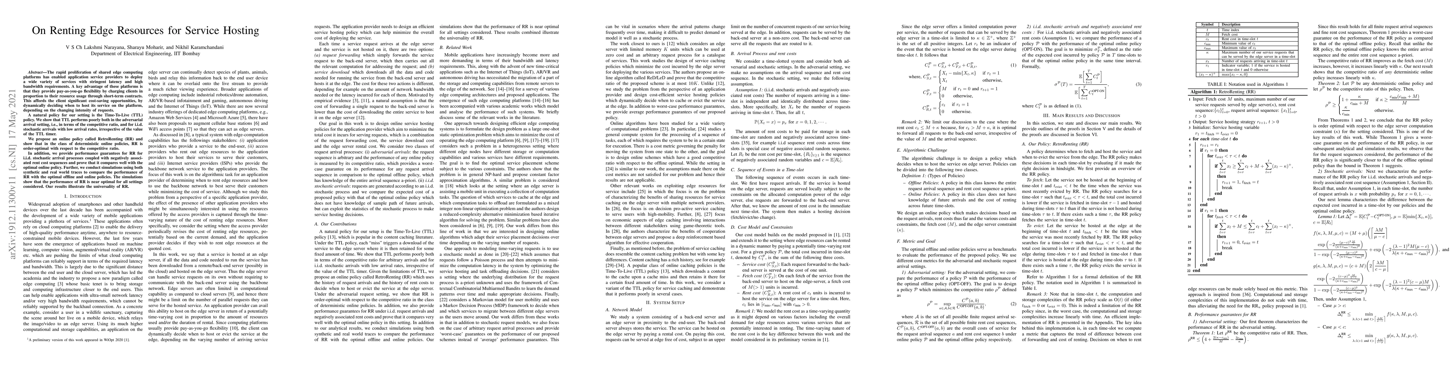 The rapid proliferation of shared edge computing platforms has enabled application service providers to deploy a wide variety of services with stringent latency and high bandwidth requirements. A key advantage of these platforms is that they provide pay-as-you-go flexibility by charging clients in proportion to their resource usage through short-term contracts. This affords the client significant cost-saving opportunities, by dynamically deciding when to host its service on the platform, depending on the changing intensity of requests. A natural policy for our setting is the Time-To-Live (TTL) policy. We show that TTL performs poorly both in the adversarial arrival setting, i.e., in terms of the competitive ratio, and for i.i.d. stochastic arrivals with low arrival rates, irrespective of the value of the TTL timer. We propose an online policy called RetroRenting (RR) and show that in the class of deterministic online policies, RR is order-optimal with respect to the competitive ratio. In addition, we provide performance guarantees for RR for i.i.d. stochastic arrival processes coupled with negatively associated rent cost sequences and prove that it compares well with the optimal online policy. Further, we conduct simulations using both synthetic and real world traces to compare the performance of RR with the optimal offline and online policies. The simulations show that the performance of RR is near optimal for all settings considered. Our results illustrate the universality of RR.