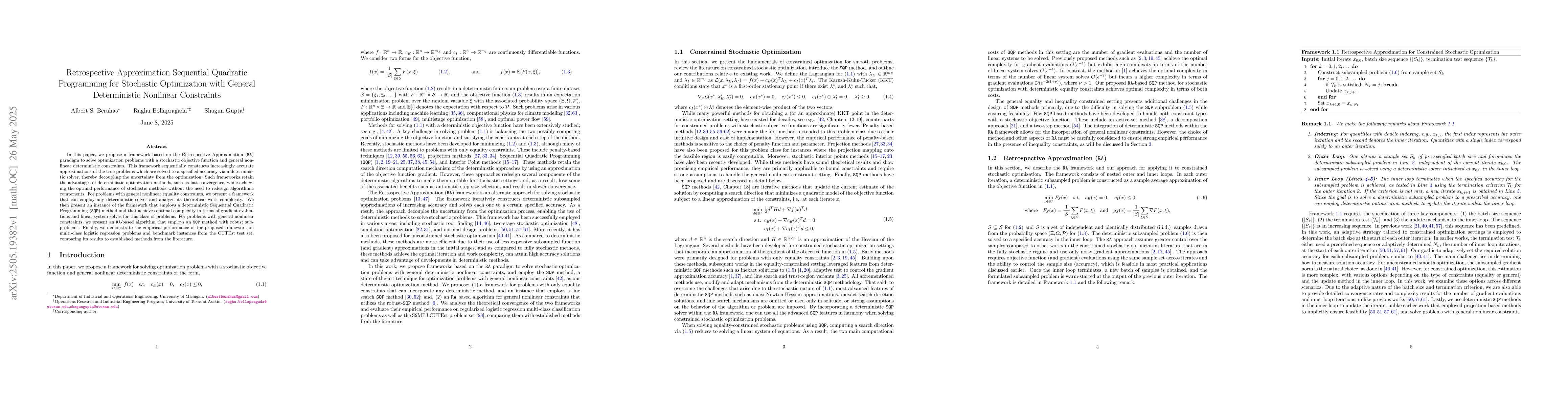 The paper proposes a Retrospective Approximation (RA) framework for solving stochastic optimization problems with deterministic nonlinear constraints, sequentially refining problem approximations to a specified accuracy using deterministic solvers.