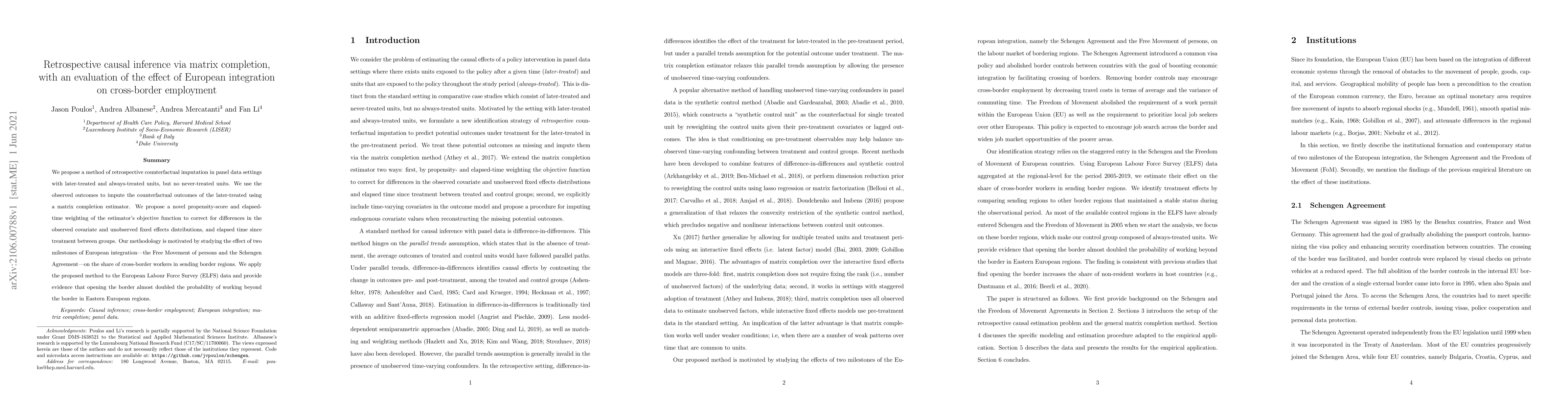 This paper introduces a matrix completion method for retrospective causal inference in panel data, focusing on later-treated and always-treated units. It evaluates the impact of European integration milestones on cross-border employment, finding that border openings significantly increased the likelihood of cross-border work in Eastern Europe.