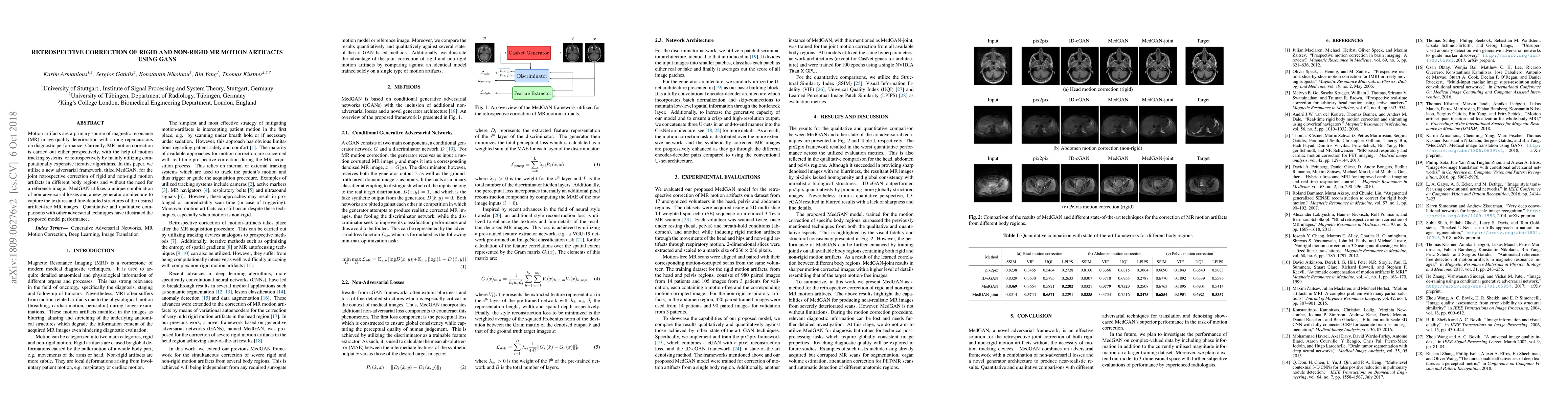 This paper introduces MedGAN, an adversarial framework for retrospectively correcting both rigid and non-rigid motion artifacts in MR images without requiring a reference image. The model combines non-adversarial losses and a specialized generator architecture to enhance image quality, outperforming other adversarial techniques in both quantitative and qualitative assessments.