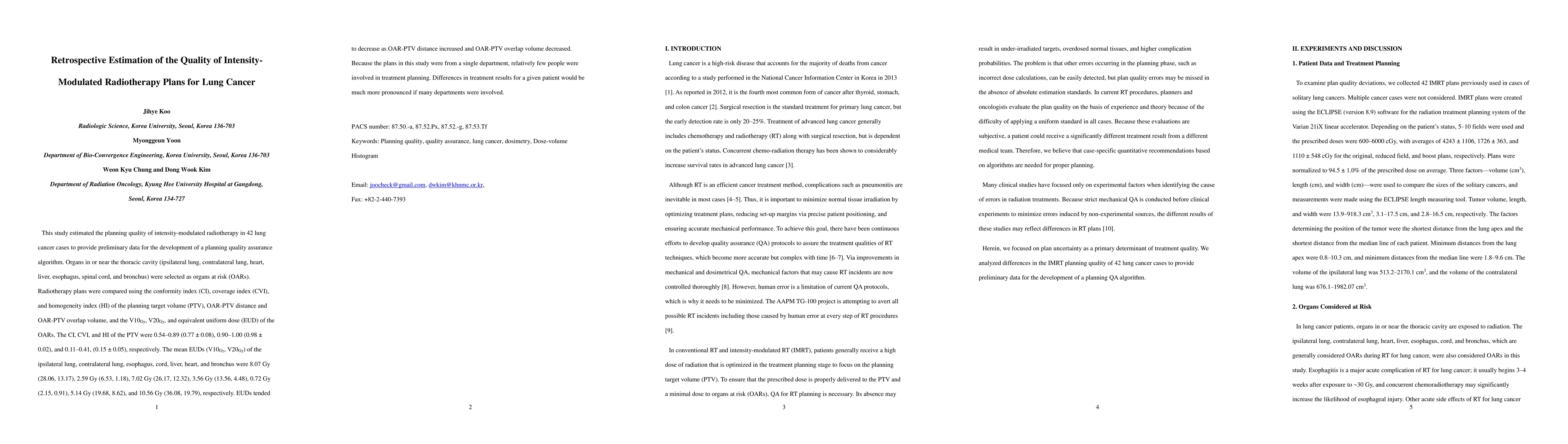 This study retrospectively evaluated the quality of intensity-modulated radiotherapy plans for 42 lung cancer cases, using indices like CI, CVI, and HI, and found that EUDs for organs at risk generally decreased with increased distance and decreased overlap with the planning target volume. The study highlights the need for a planning quality assurance algorithm.