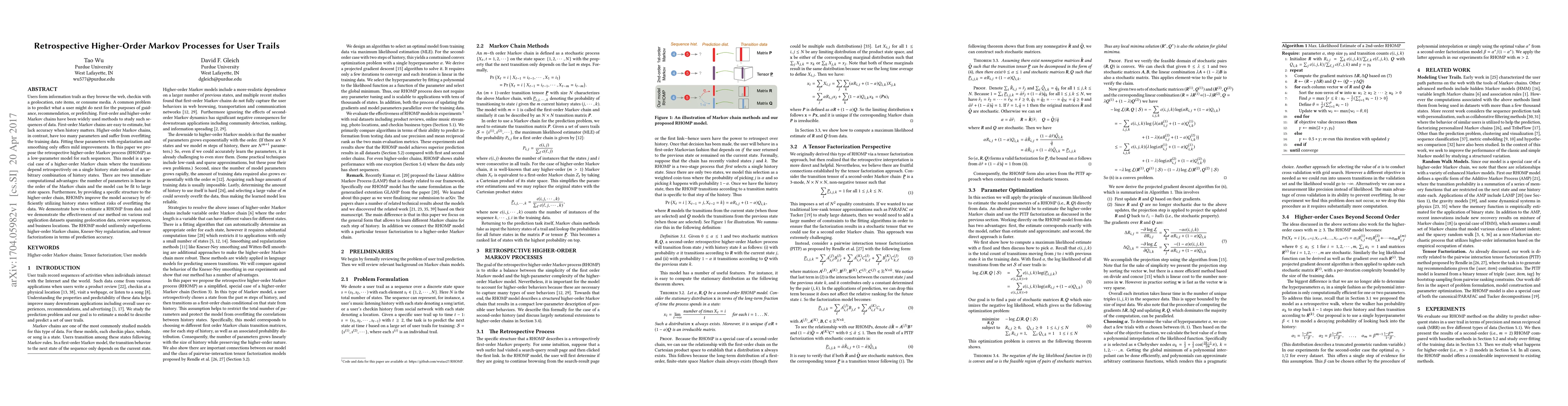 The paper proposes Retrospective Higher-Order Markov Processes (RHOMP) for modeling user trails, aiming to improve prediction accuracy while avoiding overfitting. RHOMP is a structured higher-order Markov chain model that selects a single history state and uses it to transition based on specific matrices R and Q, offering a low-parameter solution.