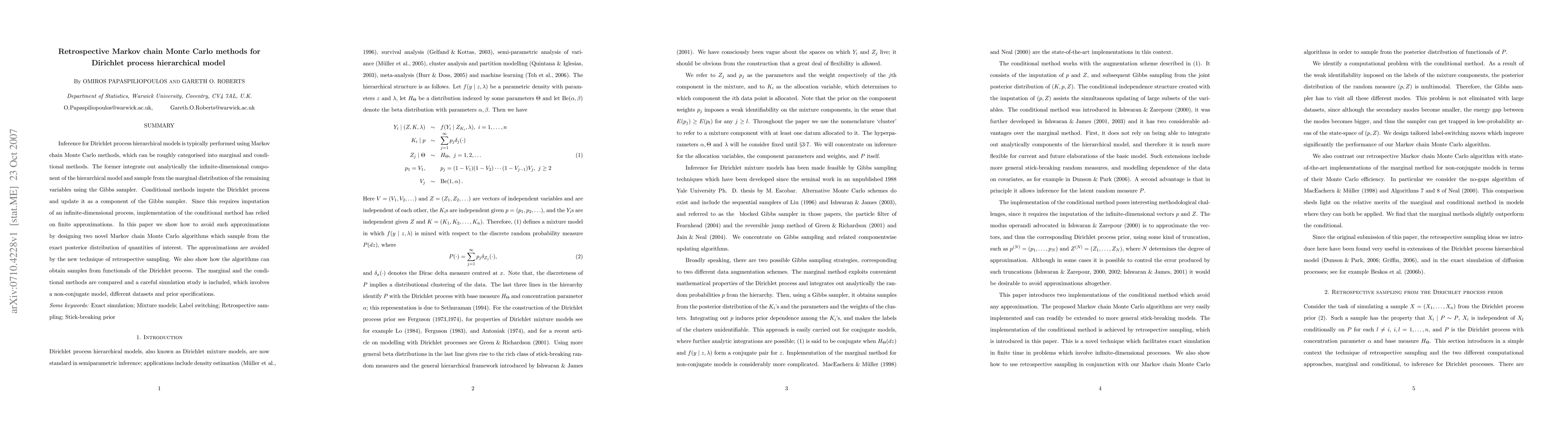 This paper introduces two novel Markov chain Monte Carlo algorithms for Dirichlet process hierarchical models that avoid finite approximations by using retrospective sampling to obtain exact posterior samples. A simulation study comparing the marginal and conditional methods is conducted, demonstrating the effectiveness of the new techniques.