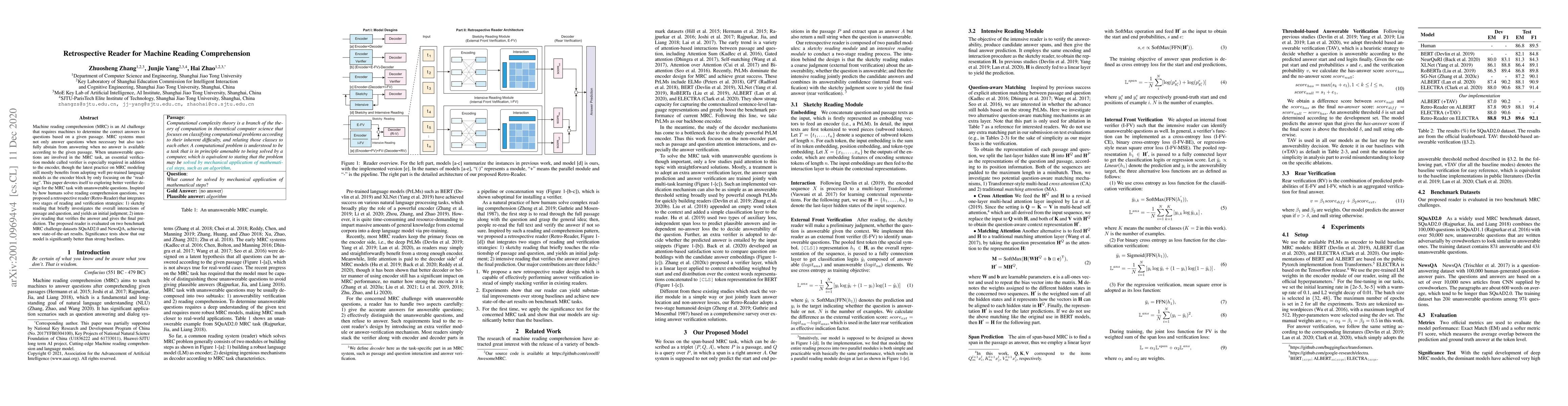 This paper proposes a Retrospective Reader for machine reading comprehension that employs two-stage verification to handle unanswerable questions effectively. The model achieves state-of-the-art results on SQuAD2.0 and NewsQA datasets, outperforming strong baselines like ELECTRA and ALBERT, demonstrating the effectiveness of its dual reading approach.