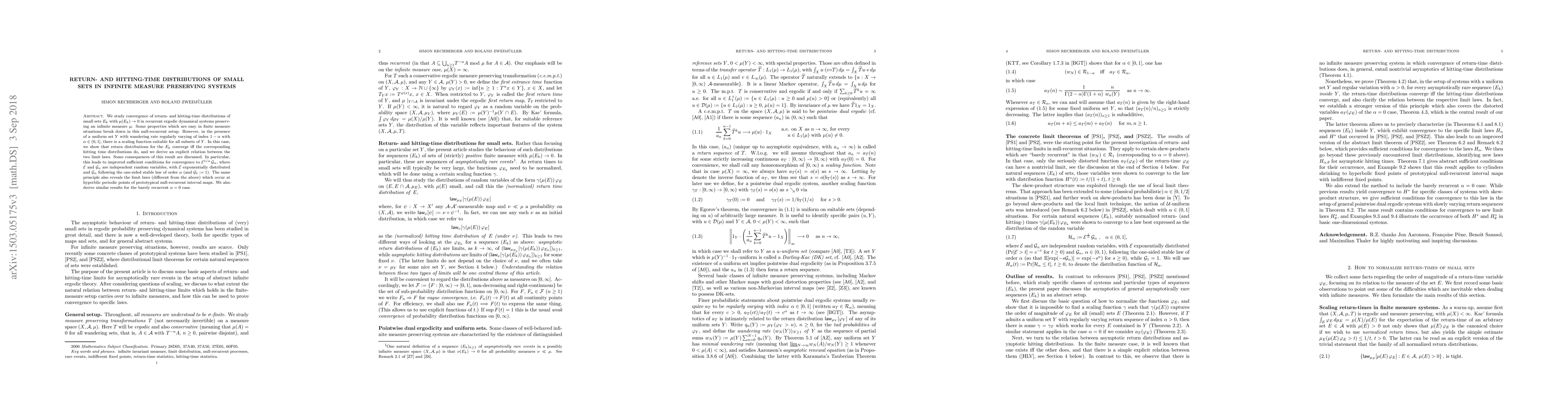 We study convergence of return- and hitting-time distributions of small sets $E_{k}$ with $\mu(E_{k})\rightarrow0$ in recurrent ergodic dynamical systems preserving an infinite measure $\mu$. Some properties which are easy in finite measure situations break down in this null-recurrent setup. However, in the presence of a uniform set $Y$ with wandering rate regularly varying of index $1-\alpha$ with $\alpha\in(0,1]$, there is a scaling function suitable for all subsets of $Y$. In this case, we show that return distributions for the $E_{k}$ converge iff the corresponding hitting time distributions do, and we derive an explicit relation between the two limit laws. Some consequences of this result are discussed. In particular, this leads to improved sufficient conditions for convergence to $\mathcal{E}^{1/\alpha}\,\mathcal{G}_{\alpha}$, where $\mathcal{E}$ and $\mathcal{G}_{\alpha}$ are independent random variables, with $\mathcal{E}$ exponentially distributed and $\mathcal{G}% _{\alpha}$ following the one-sided stable law of order $\alpha$ (and $\mathcal{G}_{1}:=1$). The same principle also reveals the limit laws (different from the above) which occur at hyperblic periodic points of prototypical null-recurrent interval maps. We also derive similar results for the barely recurrent $\alpha=0$ case.