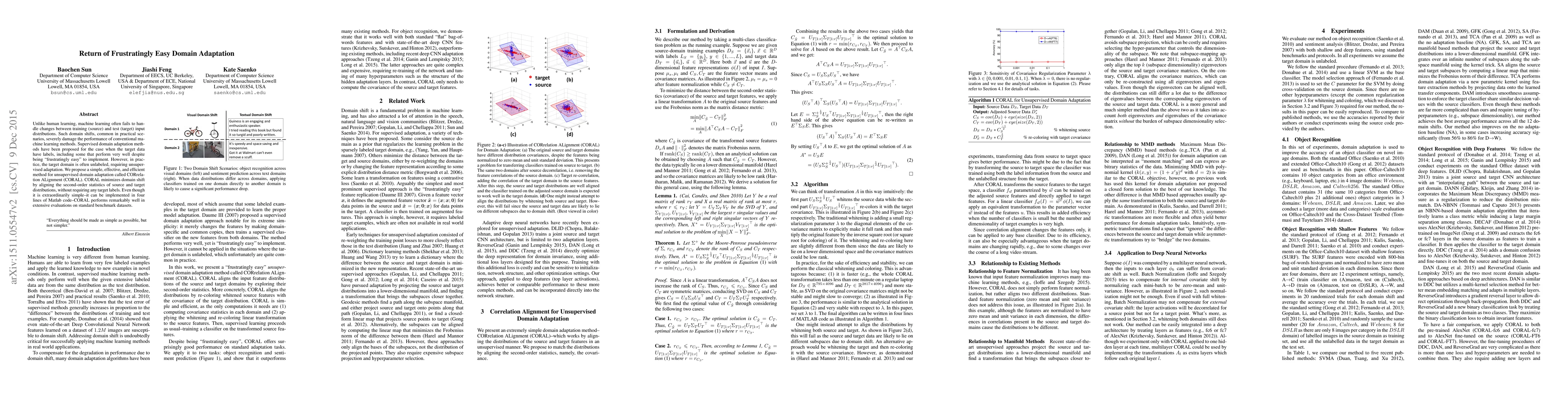 The paper proposes a simple unsupervised domain adaptation method called CORAL, which minimizes domain shift by aligning the second-order statistics of source and target distributions without requiring target labels, achieving remarkable performance in evaluations. Despite its simplicity, CORAL can be implemented in just four lines of Matlab code.