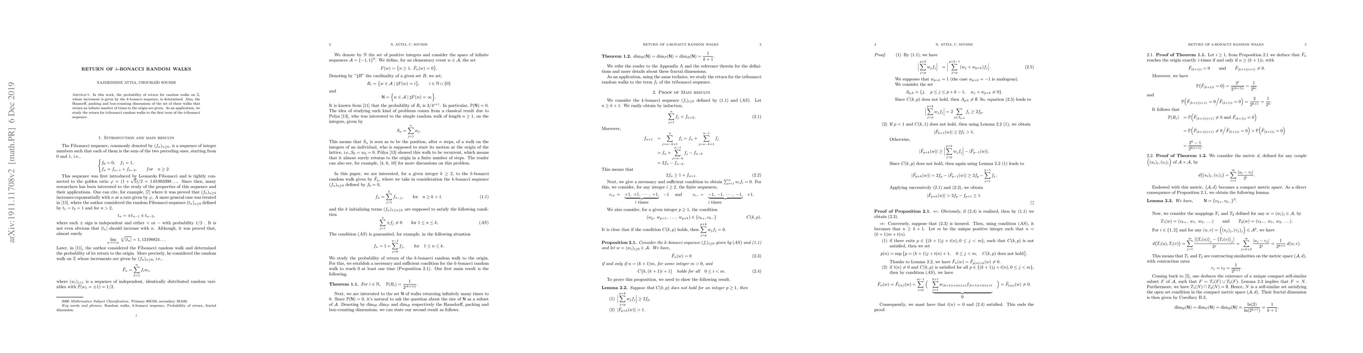 In this work, the probability of return for random walks on $\mathbb{Z}$, whose increment is given by the $k$-bonacci sequence, is determined. Also, the Hausorff, packing and box-counting dimensions of the set of these walks that return an infinite number of times to the origin are given. As an application, we study the return for tribonacci random walks to the first term of the tribonacci sequence.