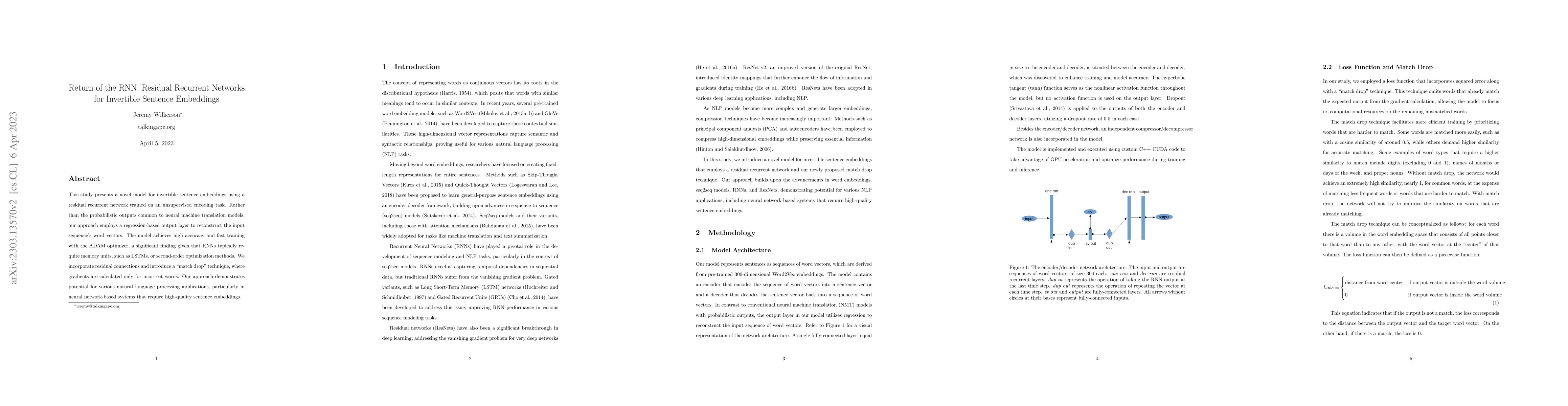 This study presents a novel model for invertible sentence embeddings using a residual recurrent network trained on an unsupervised encoding task. Rather than the probabilistic outputs common to neural machine translation models, our approach employs a regression-based output layer to reconstruct the input sequence's word vectors. The model achieves high accuracy and fast training with the ADAM optimizer, a significant finding given that RNNs typically require memory units, such as LSTMs, or second-order optimization methods. We incorporate residual connections and introduce a "match drop" technique, where gradients are calculated only for incorrect words. Our approach demonstrates potential for various natural language processing applications, particularly in neural network-based systems that require high-quality sentence embeddings.