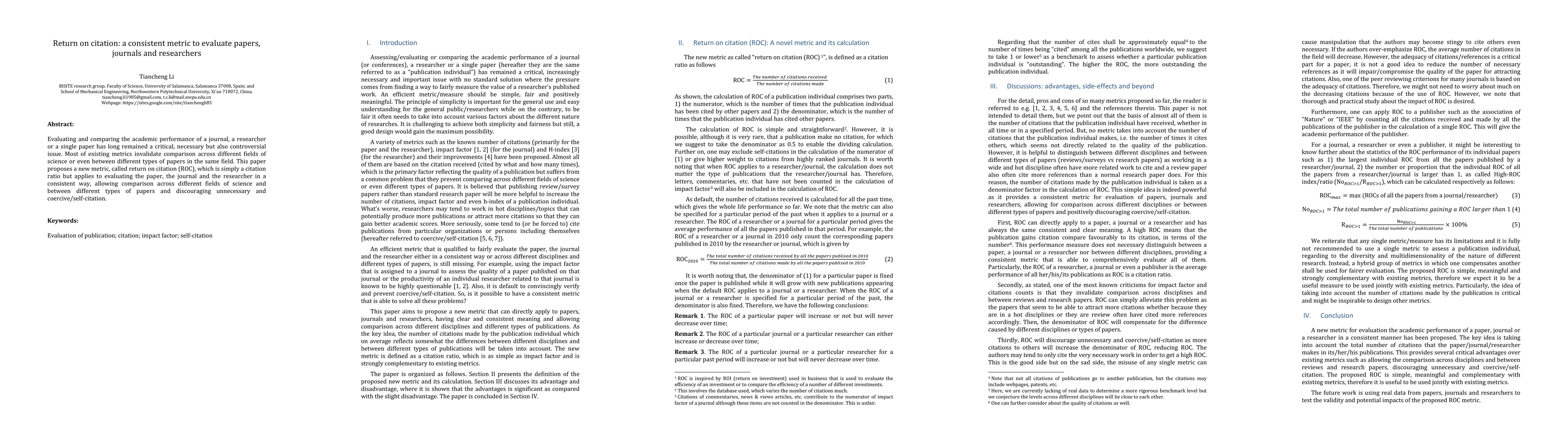 Evaluating and comparing the academic performance of a journal, a researcher or a single paper has long remained a critical, necessary but also controversial issue. Most of existing metrics invalidate comparison across different fields of science or even between different types of papers in the same field. This paper proposes a new metric, called return on citation (ROC), which is simply a citation ratio but applies to evaluating the paper, the journal and the researcher in a consistent way, allowing comparison across different fields of science and between different types of papers and discouraging unnecessary and coercive/self-citation.
