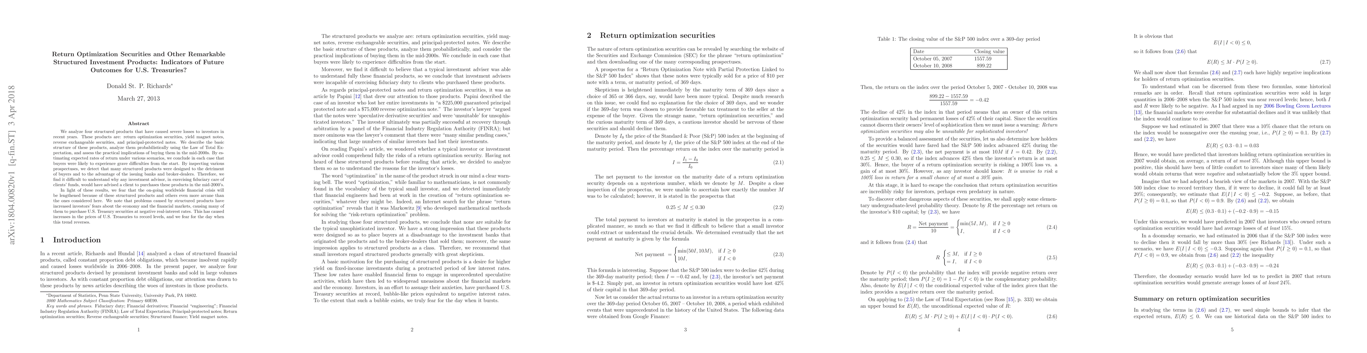 This paper examines four structured investment products—return optimization securities, yield magnet notes, reverse exchangeable securities, and principal-protected notes—that led to significant investor losses. It finds that these products were designed to benefit issuers at the expense of buyers, likely causing severe financial difficulties for investors. The study warns that the financial crisis may persist due to such products, and notes a shift in investor behavior towards U.S. Treasuries, potentially leading to unsustainable price increases.