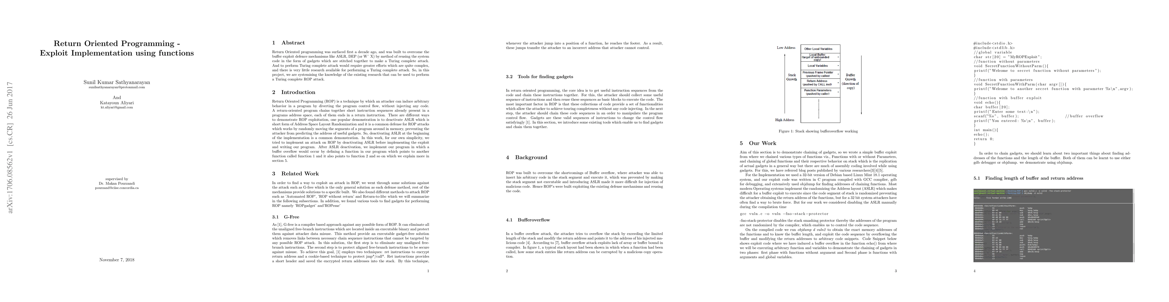 Summary: This paper explores Return Oriented Programming (ROP) as a method to bypass security defenses like ASLR and DEP by reusing existing system code. It aims to systematize existing research to facilitate more complex, Turing complete ROP attacks, addressing the current lack of studies in this area.