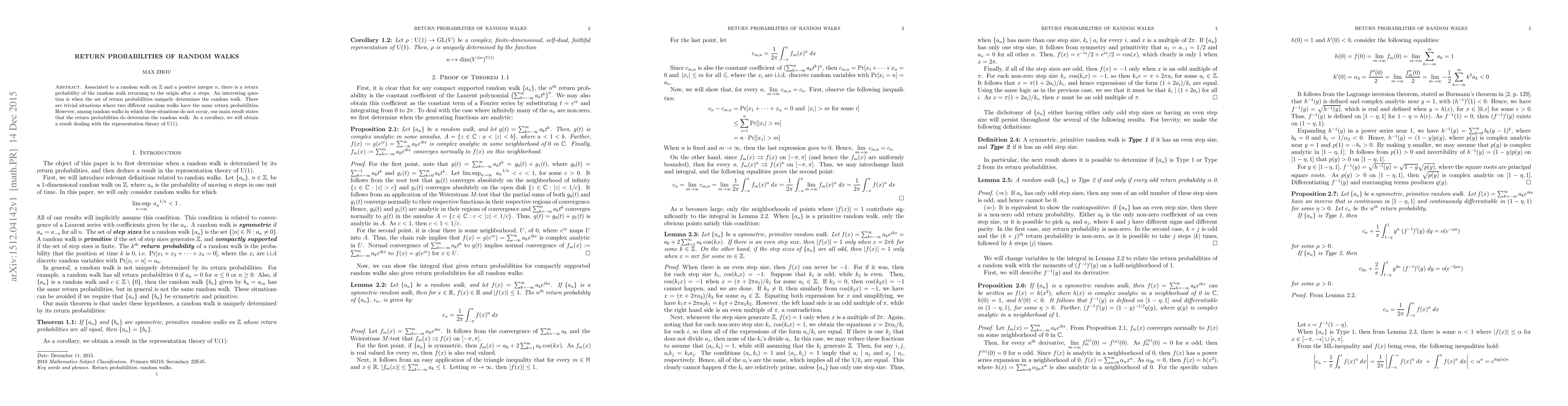 This paper investigates when the return probabilities of a random walk on $\mathbb{Z}$ uniquely determine the random walk, showing that such probabilities can uniquely identify the walk in certain cases. It also provides a corollary related to the representation theory of $\mathrm{U}(1)$.