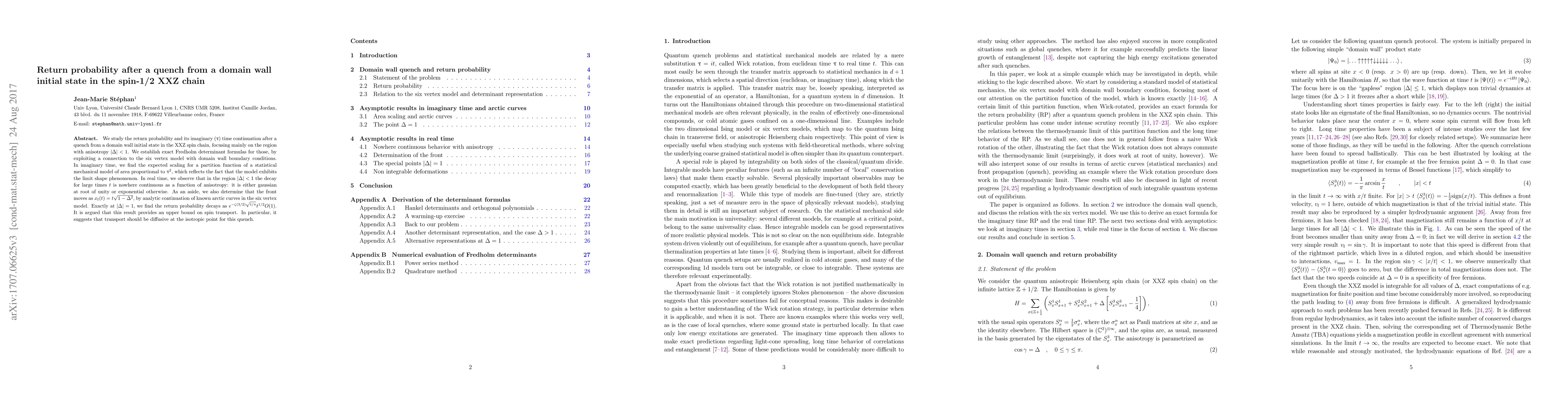 We study the return probability and its imaginary ($\tau$) time continuation after a quench from a domain wall initial state in the XXZ spin chain, focusing mainly on the region with anisotropy $|\Delta|< 1$. We establish exact Fredholm determinant formulas for those, by exploiting a connection to the six vertex model with domain wall boundary conditions. In imaginary time, we find the expected scaling for a partition function of a statistical mechanical model of area proportional to $\tau^2$, which reflects the fact that the model exhibits the limit shape phenomenon. In real time, we observe that in the region $|\Delta|<1$ the decay for large times $t$ is nowhere continuous as a function of anisotropy: it is either gaussian at root of unity or exponential otherwise. As an aside, we also determine that the front moves as $x_{\rm f}(t)=t\sqrt{1-\Delta^2}$, by analytic continuation of known arctic curves in the six vertex model. Exactly at $|\Delta|=1$, we find the return probability decays as $e^{-\zeta(3/2) \sqrt{t/\pi}}t^{1/2}O(1)$. It is argued that this result provides an upper bound on spin transport. In particular, it suggests that transport should be diffusive at the isotropic point for this quench.