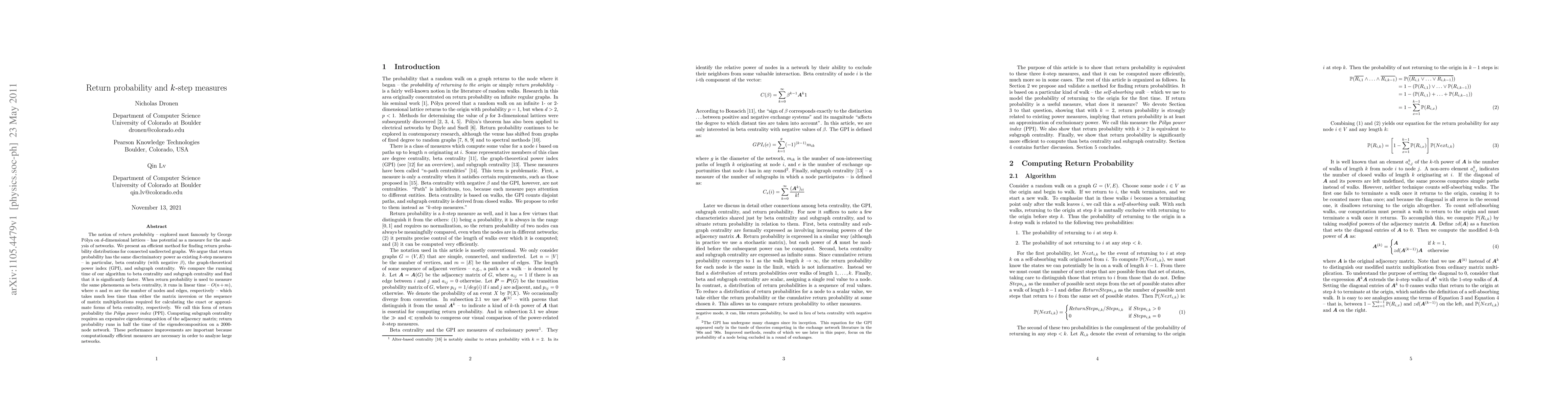 This paper introduces an efficient method for calculating return probability distributions in connected undirected graphs, demonstrating its linear time complexity (O(n+m)). It argues that return probability, termed the Pólya power index (PPI), is as effective as existing k-step measures like beta centrality and subgraph centrality, while significantly outperforming them in computational efficiency.