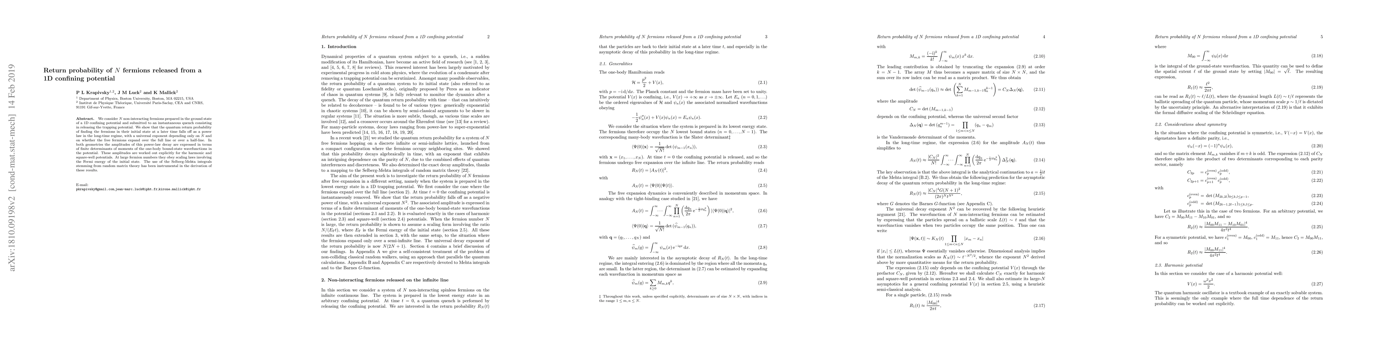This paper investigates the quantum return probability of $N$ non-interacting fermions released from a 1D confining potential after an instantaneous quench. It finds a power-law decay in the long-time regime, with universal exponents dependent on the number of fermions and the expansion geometry, derived using Selberg-Mehta integrals from random matrix theory.