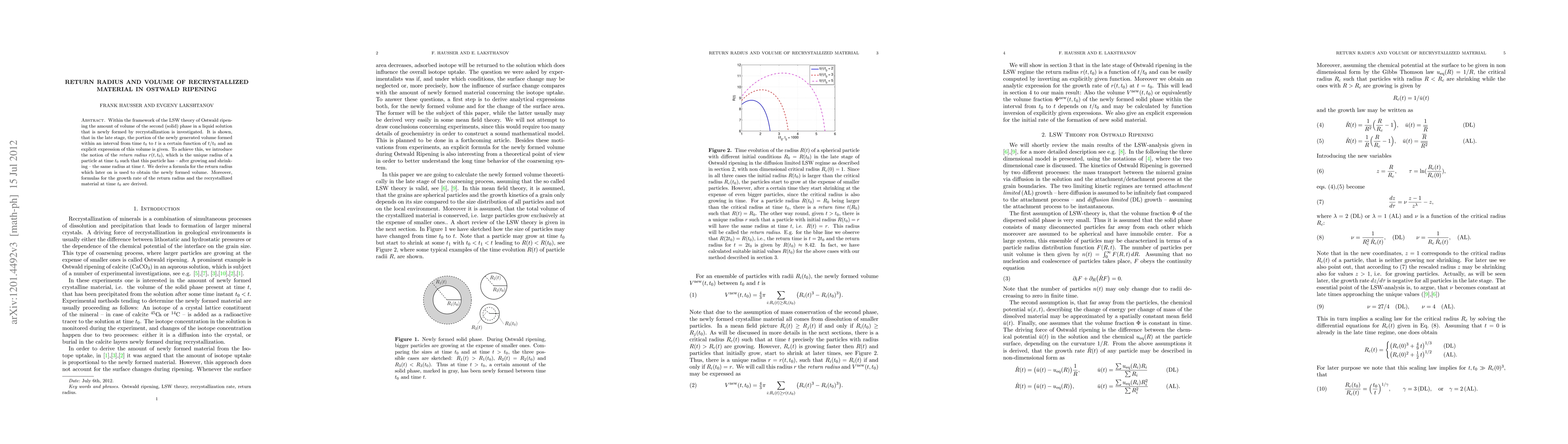 Within the framework of the LSW theory of Ostwald ripening the amount of volume of the second (solid) phase that is newly formed by recrystallization is investigated. It is shown, that in the late stage, the portion of the newly generated volume formed within an interval from time $t_0$ to $t$ is a certain function of $t/t_0$ and an explicit expression of this volume is given. To achieve this, we introduce the notion of the {\it return radius} $r(t,t_0)$, which is the unique radius of a particle at time $t_0$ such that this particle has -- after growing and shrinking -- the same radius at time $t$. We derive a formula for the return radius which later on is used to obtain the newly formed volume. Moreover, formulas for the growth rate of the return radius and the recrystallized material at time $t_0$ are derived.