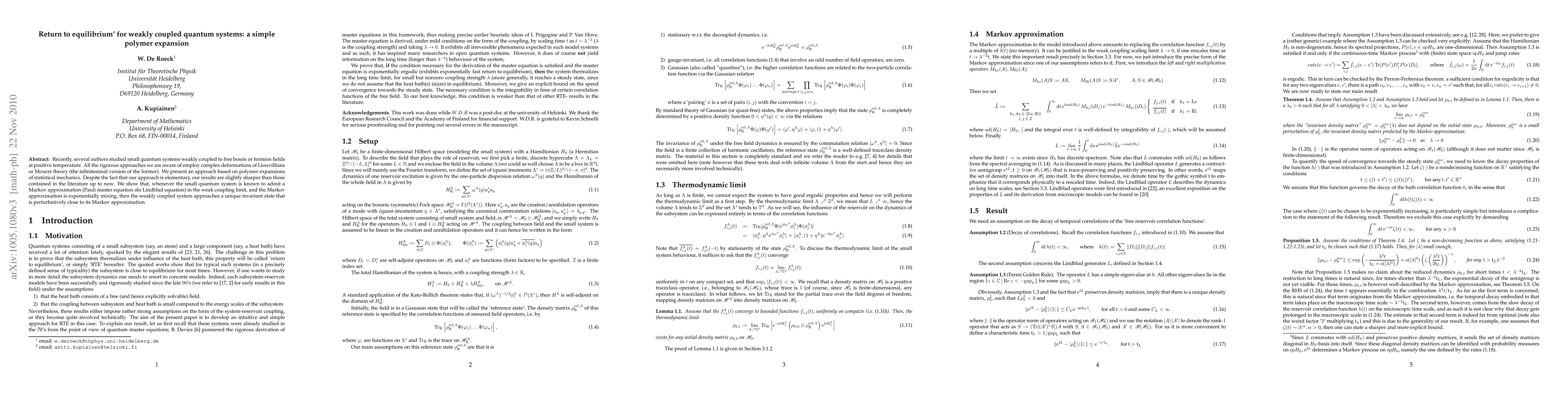 Recently, several authors studied small quantum systems weakly coupled to free boson or fermion fields at positive temperature. All the approaches we are aware of employ complex deformations of Liouvillians or Mourre theory (the infinitesimal version of the former). We present an approach based on polymer expansions of statistical mechanics. Despite the fact that our approach is elementary, our results are slightly sharper than those contained in the literature up to now. We show that, whenever the small quantum system is known to admit a Markov approximation (Pauli master equation \emph{aka} Lindblad equation) in the weak coupling limit, and the Markov approximation is exponentially mixing, then the weakly coupled system approaches a unique invariant state that is perturbatively close to its Markov approximation.