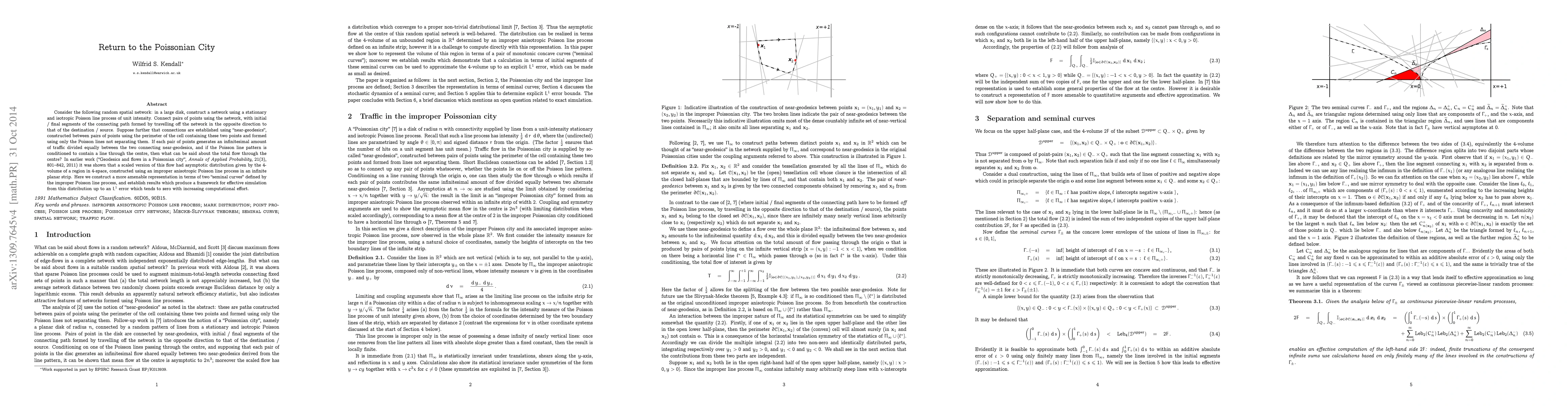 Consider the following random spatial network: in a large disk, construct a network using a stationary and isotropic Poisson line process of unit intensity. Connect pairs of points using the network, with initial / final segments of the connecting path formed by travelling off the network in the opposite direction to that of the destination / source. Suppose further that connections are established using "near-geodesics", constructed between pairs of points using the perimeter of the cell containing these two points and formed using only the Poisson lines not separating them. If each pair of points generates an infinitesimal amount of traffic divided equally between the two connecting near-geodesics, and if the Poisson line pattern is conditioned to contain a line through the centre, then what can be said about the total flow through the centre? In earlier work ("Geodesics and flows in a Poissonian city", Annals of Applied Probability, 21(3), 801--842, 2011) it was shown that a scaled version of this flow had asymptotic distribution given by the 4-volume of a region in 4-space, constructed using an improper anisotropic Poisson line process in an infinite planar strip. Here we construct a more amenable representation in terms of two "seminal curves" defined by the improper Poisson line process, and establish results which produce a framework for effective simulation from this distribution up to an L1 error which tends to zero with increasing computational effort.