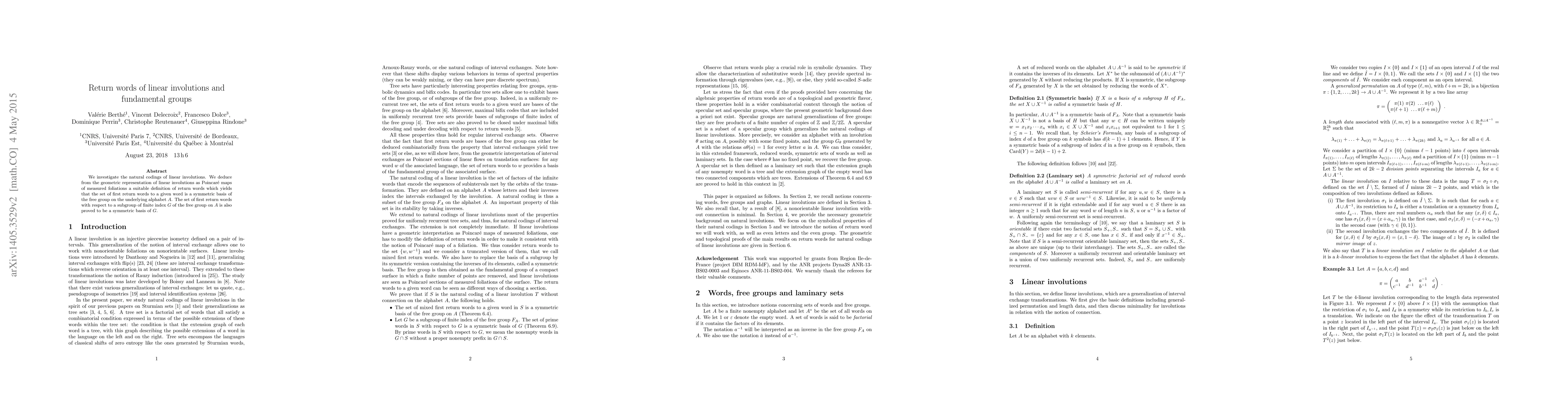 We investigate the natural codings of linear involutions. We deduce from the geometric representation of linear involutions as Poincar\'e maps of measured foliations a suitable definition of return words which yields that the set of first return words to a given word is a symmetric basis of the free group on the underlying alphabet $A$. The set of first return words with respect to a subgroup of finite index $G$ of the free group on $A$ is also proved to be a symmetric basis of $G$.