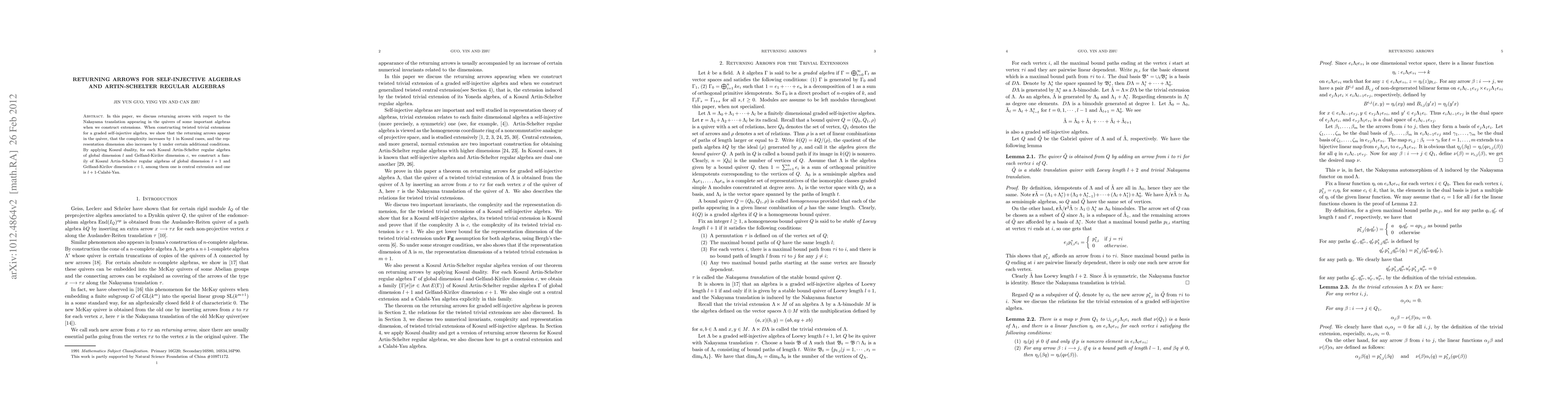 In this paper, we discuss returning arrows with respect to the Nakayama translation appearing in the quivers of some important algebras when we construct extensions. When constructing twisted trivial extensions for a graded self-injective algebra, we show that the returning arrows appear in the quiver, that the complexity increases by 1 in Koszul cases, and the representation dimension also increases by 1 under certain additional conditions. By applying Koszul duality, for each Koszul Artin-Schelter regular algebra of global dimension l and Gelfand-Kirilov dimension $c$, we construct a family of Koszul Artin-Schelter regular algebras of global dimension $l+1$ and Gelfand-Kirilov dimension $c+1$, among them one is central extension and one is $l+1$-Calabi-Yau.