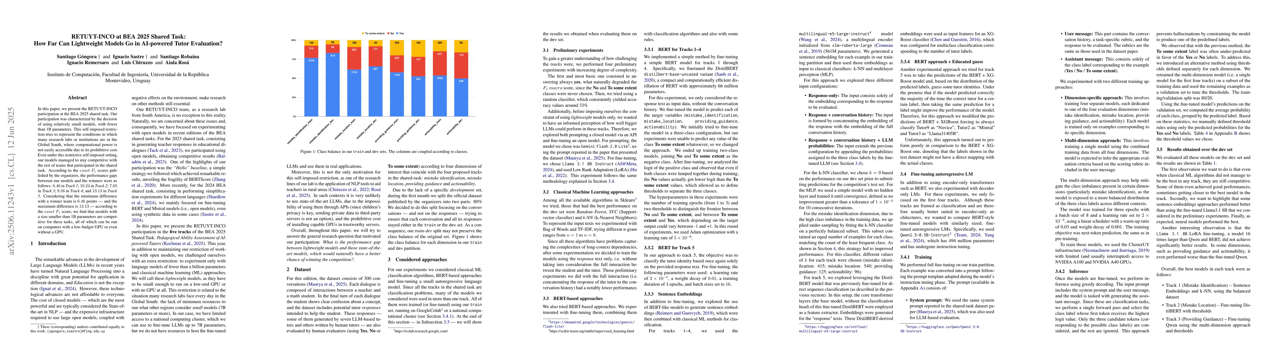 In this paper, we present the RETUYT-INCO participation at the BEA 2025 shared task. Our participation was characterized by the decision of using relatively small models, with fewer than 1B parameters. This self-imposed restriction tries to represent the conditions in which many research labs or institutions are in the Global South, where computational power is not easily accessible due to its prohibitive cost. Even under this restrictive self-imposed setting, our models managed to stay competitive with the rest of teams that participated in the shared task. According to the $exact\ F_1$ scores published by the organizers, the performance gaps between our models and the winners were as follows: $6.46$ in Track 1; $10.24$ in Track 2; $7.85$ in Track 3; $9.56$ in Track 4; and $13.13$ in Track 5. Considering that the minimum difference with a winner team is $6.46$ points -- and the maximum difference is $13.13$ -- according to the $exact\ F_1$ score, we find that models with a size smaller than 1B parameters are competitive for these tasks, all of which can be run on computers with a low-budget GPU or even without a GPU.