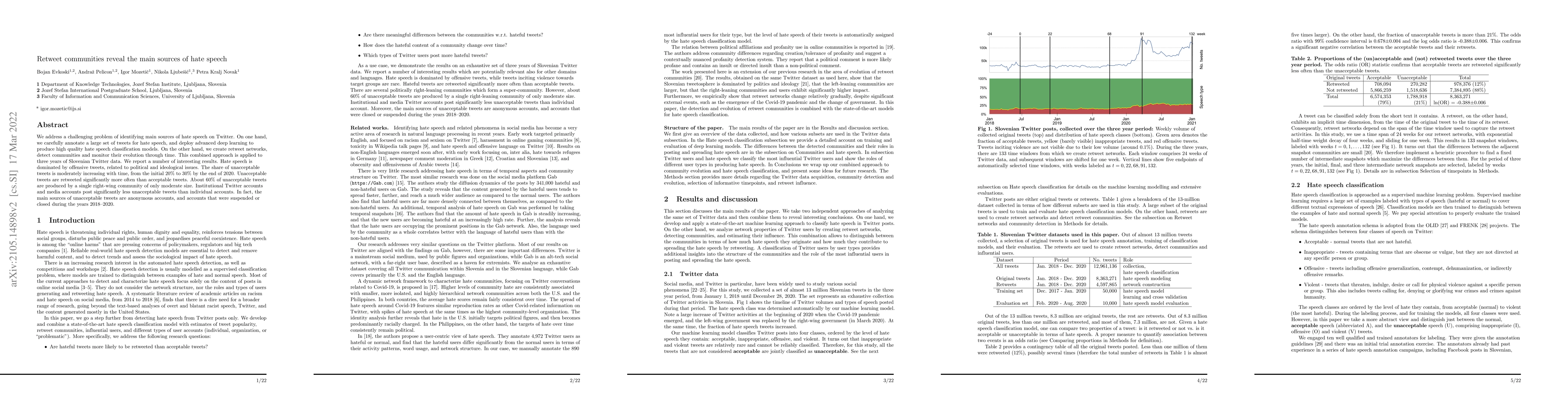 We address a challenging problem of identifying main sources of hate speech on Twitter. On one hand, we carefully annotate a large set of tweets for hate speech, and deploy advanced deep learning to produce high quality hate speech classification models. On the other hand, we create retweet networks, detect communities and monitor their evolution through time. This combined approach is applied to three years of Slovenian Twitter data. We report a number of interesting results. Hate speech is dominated by offensive tweets, related to political and ideological issues. The share of unacceptable tweets is moderately increasing with time, from the initial 20% to 30% by the end of 2020. Unacceptable tweets are retweeted significantly more often than acceptable tweets. About 60% of unacceptable tweets are produced by a single right-wing community of only moderate size. Institutional Twitter accounts and media accounts post significantly less unacceptable tweets than individual accounts. In fact, the main sources of unacceptable tweets are anonymous accounts, and accounts that were suspended or closed during the years 2018-2020.
