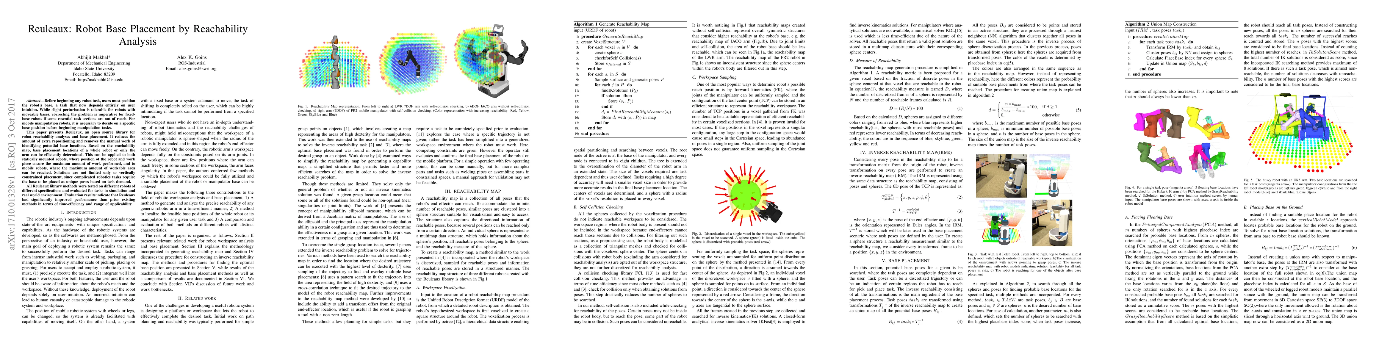 This paper introduces Reuleaux, an open-source library for robot reachability analysis and base placement, which automates the determination of optimal base positions for both static and mobile robots, reducing manual effort and repositioning. Evaluations show significant improvements in time-efficiency and applicability over existing methods.