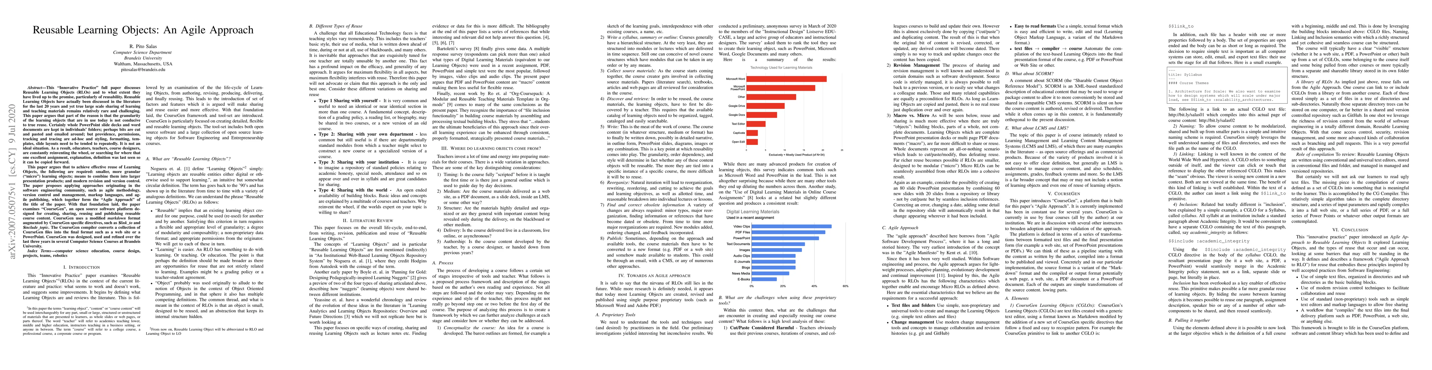 This paper discusses Reusable Learning Objects (RLOs) and to what extent they have lived up to the promise, particularly of reusability. Reusable Learning Objects have actually been discussed in the literature for the last 20 years and yet true large scale sharing of learning and teaching materials remains relatively rare and challenging. This paper argues that part of the reason is that the granularity of the learning objects that are in use today is not conducive to true reuse. Certainly whole PowerPoint slide decks and word documents are kept in individual files and folders. It is not an ideal situation. As a result, educators, teachers, course designers, are constantly reinventing the wheel, or searching for where that one excellent assignment, explanation, definition was last seen so it can be copied forward. This paper argues that to achieve effective reuse of Learning Objects, the following are required: smaller, more granular (micro) learning objects; means to combine them into larger presentation products; and modern revision and version control. The paper proposes applying approaches originating in the software engineering community, such as agile methodology, version control and management, markup languages, and agile publishing, which together form the Agile Approach of the title of the paper. With that foundation laid, the paper examines CourseGen, an open source software platform designed for creating, sharing, reusing and publishing reusable course content. CourseGen uses a modified markdown format augmented by CourseGen specific directives, such as $link to and $include topic. The CourseGen compiler converts a collection of CourseGen files into the final format such as a web site or a PowerPoint. CourseGen was designed, used and refined over the last three years in several Computer Science Courses at Brandeis University.