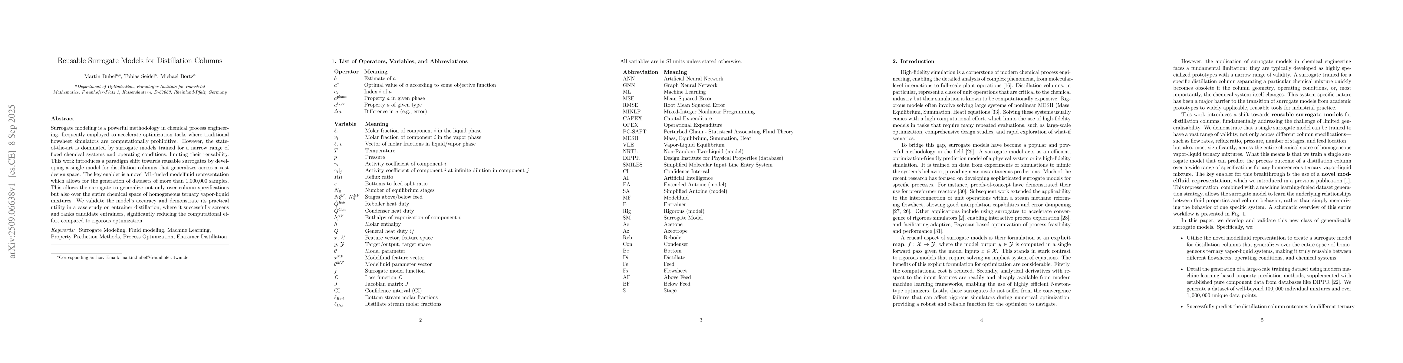Surrogate modeling is a powerful methodology in chemical process engineering, frequently employed to accelerate optimization tasks where traditional flowsheet simulators are computationally prohibitive. However, the state-of-the-art is dominated by surrogate models trained for a narrow range of fixed chemical systems and operating conditions, limiting their reusability. This work introduces a paradigm shift towards reusable surrogates by developing a single model for distillation columns that generalizes across a vast design space. The key enabler is a novel ML-fueled modelfluid representation which allows for the generation of datasets of more than $1,000,000$ samples. This allows the surrogate to generalize not only over column specifications but also over the entire chemical space of homogeneous ternary vapor-liquid mixtures. We validate the model's accuracy and demonstrate its practical utility in a case study on entrainer distillation, where it successfully screens and ranks candidate entrainers, significantly reducing the computational effort compared to rigorous optimization.
