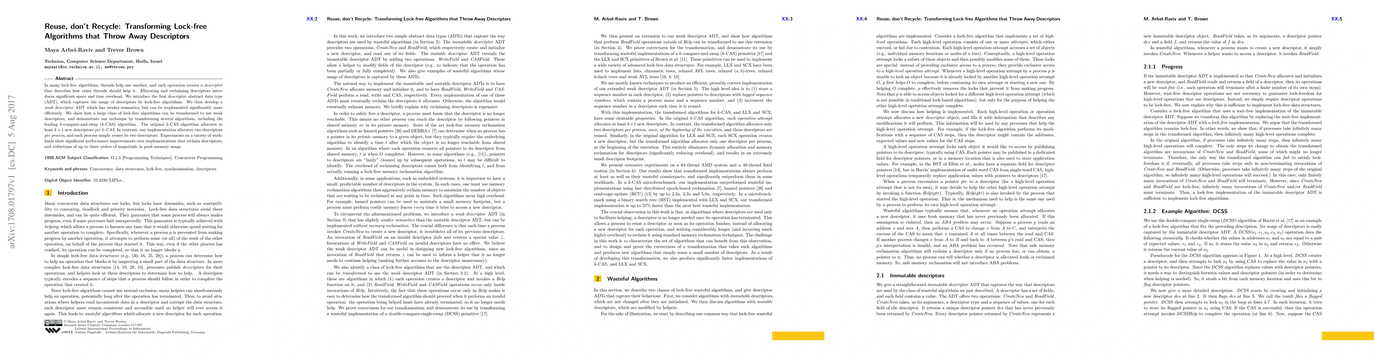 This paper introduces a descriptor abstract data type (ADT) to optimize lock-free algorithms by reusing descriptors instead of allocating and reclaiming them, significantly reducing space and time overhead. The proposed weak descriptor ADT enables efficient transformation of various lock-free algorithms, demonstrated through the k-compare-and-swap (k-CAS) algorithm, showing substantial performance improvements and memory usage reductions.