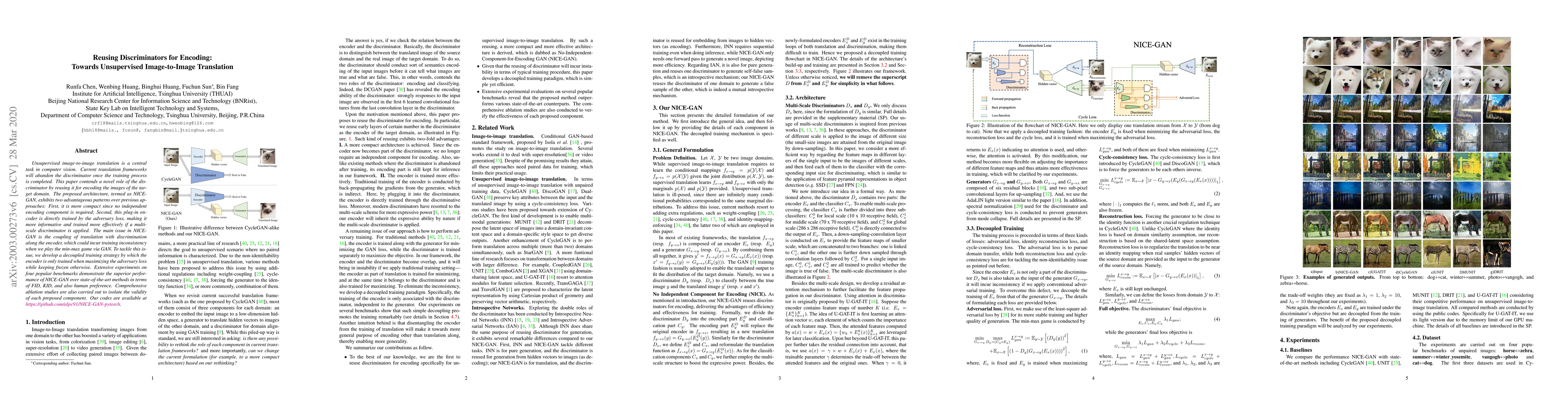 NICE-GAN proposes a novel approach to unsupervised image-to-image translation by reusing the discriminator for encoding, achieving superior performance over state-of-the-art methods on FID, KID, and human preference metrics.
