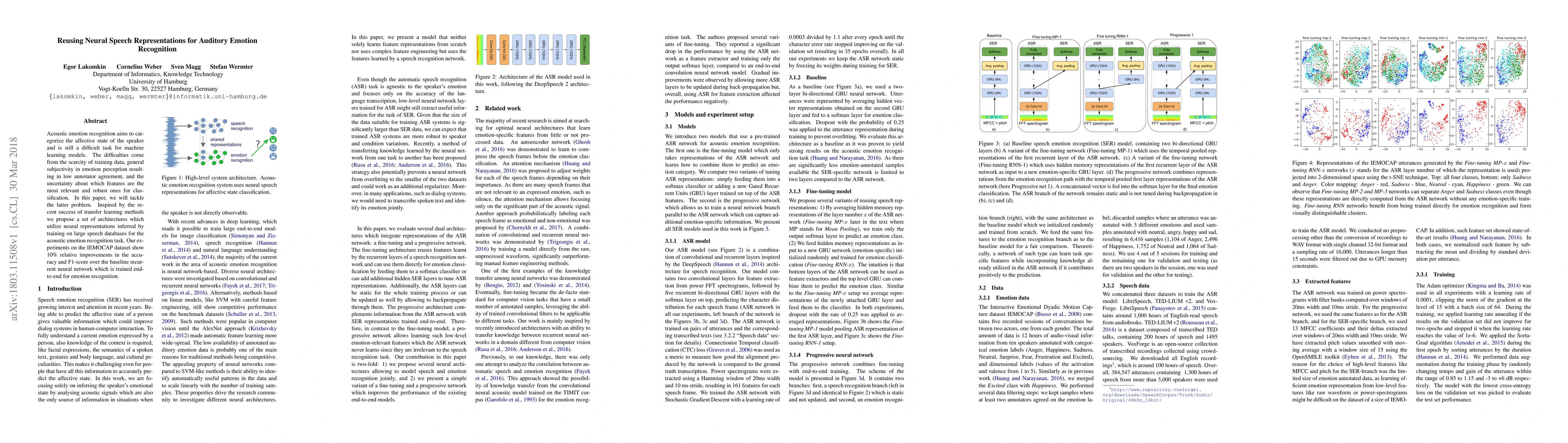 Acoustic emotion recognition aims to categorize the affective state of the speaker and is still a difficult task for machine learning models. The difficulties come from the scarcity of training data, general subjectivity in emotion perception resulting in low annotator agreement, and the uncertainty about which features are the most relevant and robust ones for classification. In this paper, we will tackle the latter problem. Inspired by the recent success of transfer learning methods we propose a set of architectures which utilize neural representations inferred by training on large speech databases for the acoustic emotion recognition task. Our experiments on the IEMOCAP dataset show ~10% relative improvements in the accuracy and F1-score over the baseline recurrent neural network which is trained end-to-end for emotion recognition.