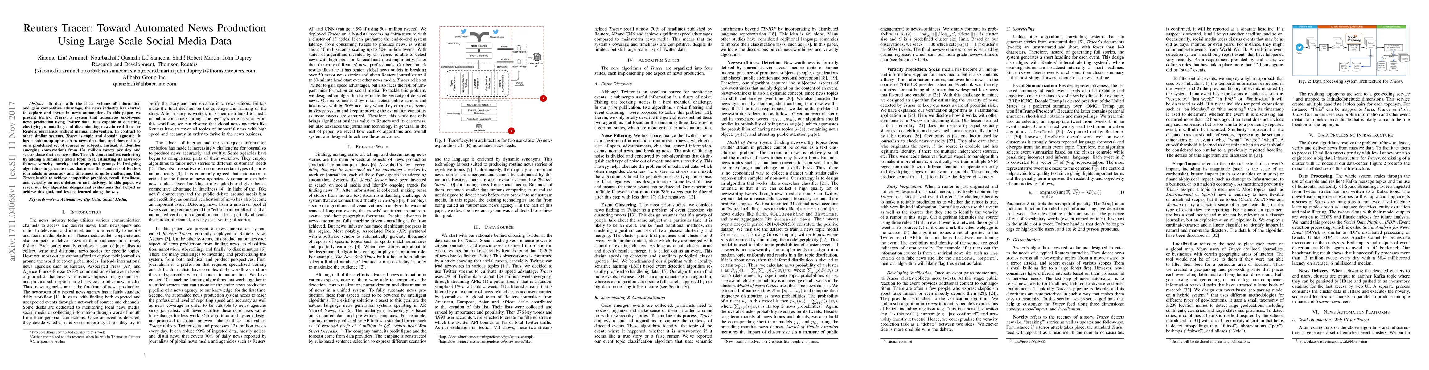 To deal with the sheer volume of information and gain competitive advantage, the news industry has started to explore and invest in news automation. In this paper, we present Reuters Tracer, a system that automates end-to-end news production using Twitter data. It is capable of detecting, classifying, annotating, and disseminating news in real time for Reuters journalists without manual intervention. In contrast to other similar systems, Tracer is topic and domain agnostic. It has a bottom-up approach to news detection, and does not rely on a predefined set of sources or subjects. Instead, it identifies emerging conversations from 12+ million tweets per day and selects those that are news-like. Then, it contextualizes each story by adding a summary and a topic to it, estimating its newsworthiness, veracity, novelty, and scope, and geotags it. Designing algorithms to generate news that meets the standards of Reuters journalists in accuracy and timeliness is quite challenging. But Tracer is able to achieve competitive precision, recall, timeliness, and veracity on news detection and delivery. In this paper, we reveal our key algorithm designs and evaluations that helped us achieve this goal, and lessons learned along the way.
