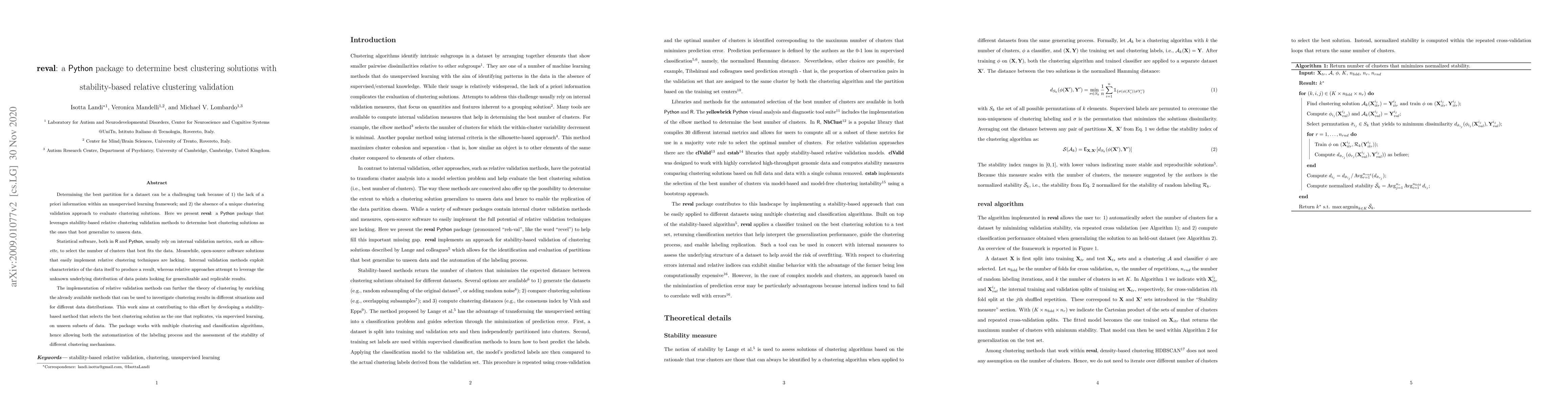 The reval Python package employs stability-based relative clustering validation to determine the best clustering solutions that generalize to unseen data. It aims to address the lack of open-source software for relative clustering validation, offering a tool that automates the labeling process and assesses stability across different clustering algorithms.