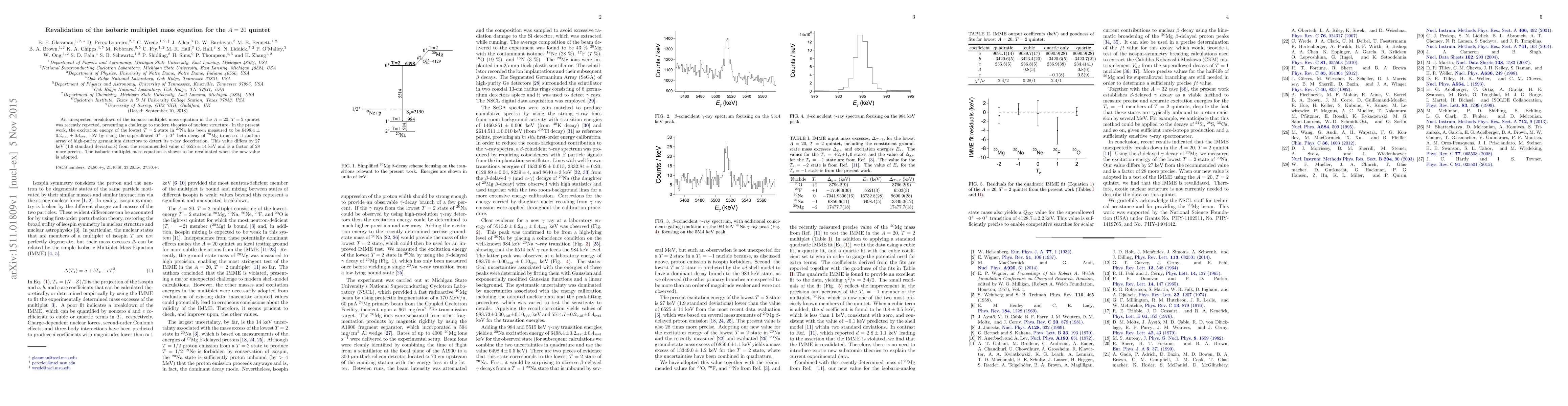 An unexpected breakdown of the isobaric multiplet mass equation in the $A=20$, $T=2$ quintet was recently reported, presenting a challenge to modern theories of nuclear structure. In the present work, the excitation energy of the lowest $T = 2$ state in $^{20}$Na has been measured to be $6498.4 \pm 0.2_{\textrm{stat}} \pm 0.4_{\textrm{syst}}$ keV by using the superallowed $0^+ \rightarrow 0^+$ beta decay of $^{20}$Mg to access it and an array of high-purity germanium detectors to detect its $\gamma$-ray deexcitation. This value differs by 27 keV (1.9 standard deviations) from the recommended value of $6525 \pm 14$ keV and is a factor of 28 more precise. The isobaric multiplet mass equation is shown to be revalidated when the new value is adopted.