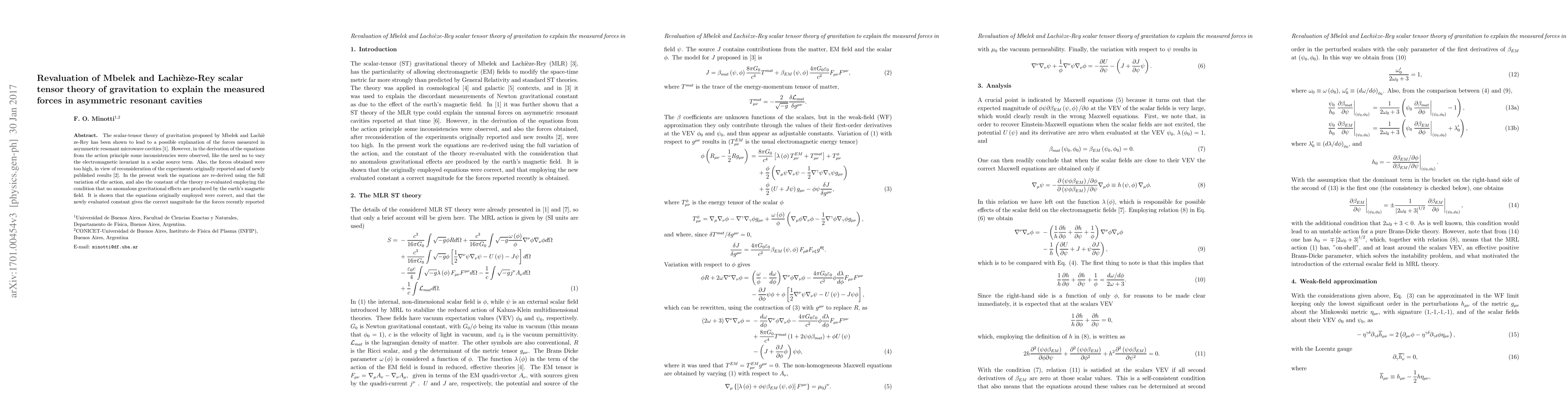 This paper reevaluates the scalar-tensor theory of gravitation by Mbelek and Lachièze-Rey to explain forces in asymmetric resonant cavities, correcting inconsistencies in the original derivation and recalculating the theory's constant to match recent experimental results. The revised theory now accurately predicts the measured forces.