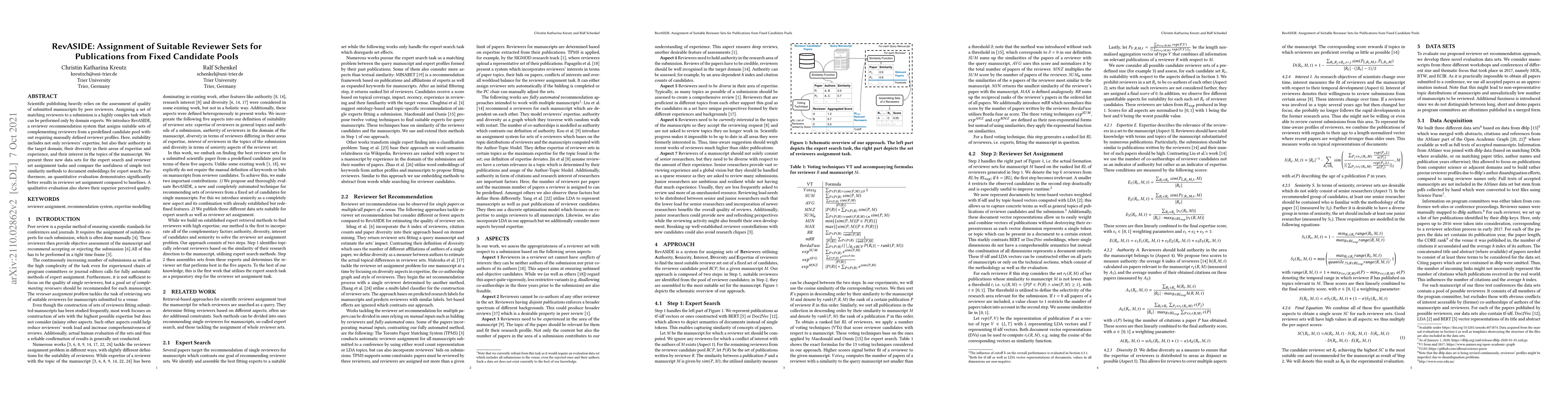 Scientific publishing heavily relies on the assessment of quality of submitted manuscripts by peer reviewers. Assigning a set of matching reviewers to a submission is a highly complex task which can be performed only by domain experts. We introduce RevASIDE, a reviewer recommendation system that assigns suitable sets of complementing reviewers from a predefined candidate pool without requiring manually defined reviewer profiles. Here, suitability includes not only reviewers' expertise, but also their authority in the target domain, their diversity in their areas of expertise and experience, and their interest in the topics of the manuscript. We present three new data sets for the expert search and reviewer set assignment tasks and compare the usefulness of simple text similarity methods to document embeddings for expert search. Furthermore, an quantitative evaluation demonstrates significantly better results in reviewer set assignment compared to baselines. A qualitative evaluation also shows their superior perceived quality.