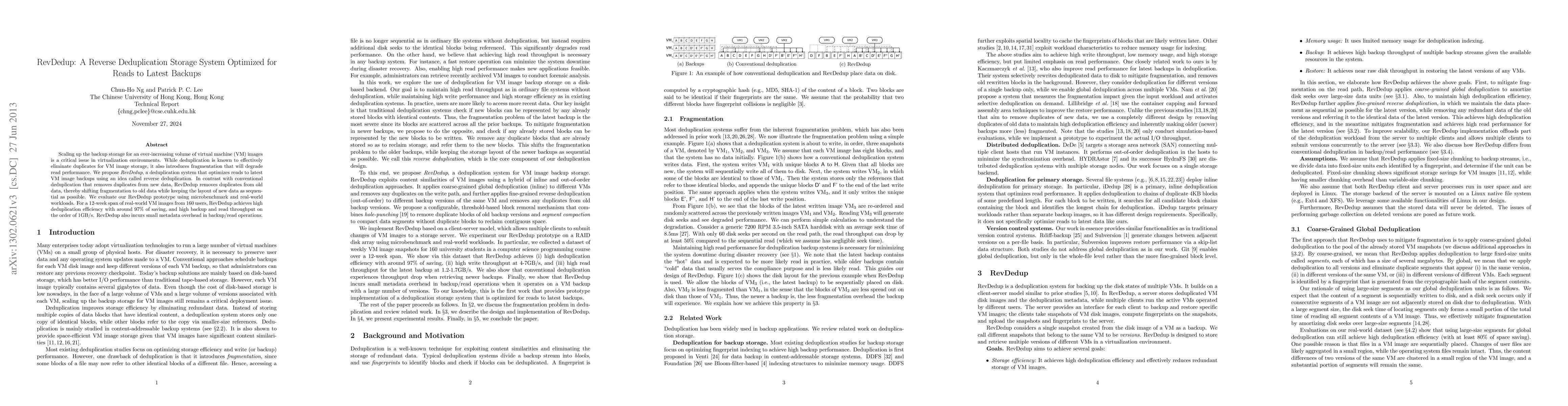 RevDedup is a reverse deduplication storage system designed to optimize read performance for the latest backups of virtual machine images by minimizing fragmentation. It achieves high deduplication efficiency and backup/read throughput with minimal metadata overhead.
