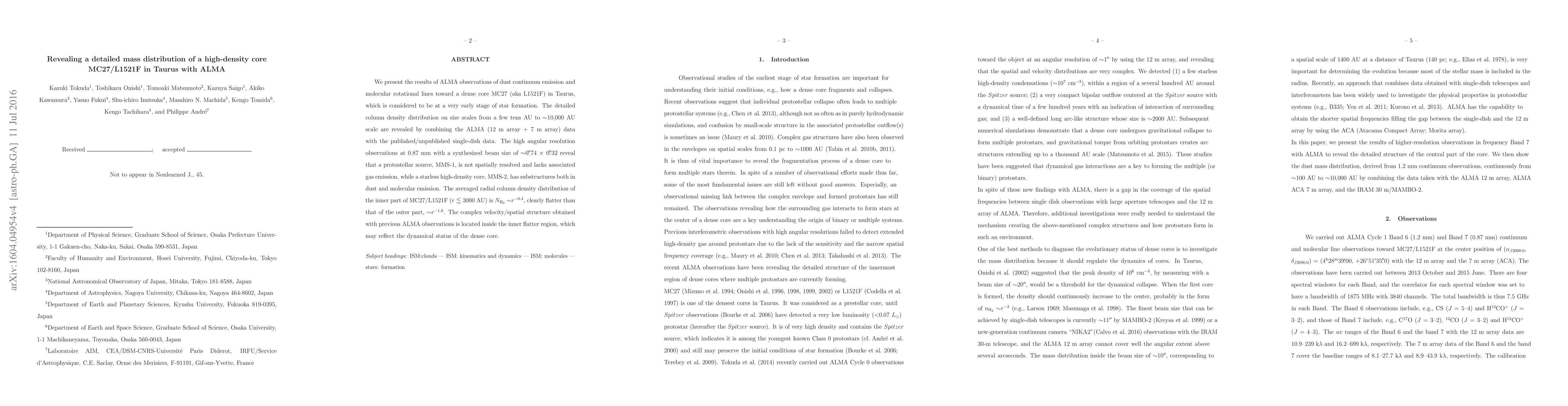 This paper uses ALMA observations to reveal the detailed mass distribution of the high-density core MC27/L1521F in Taurus, showing a flatter radial column density distribution in its inner region compared to the outer part. The study identifies protostellar and starless cores, highlighting the complex velocity/spatial structure indicative of the core's dynamical status.