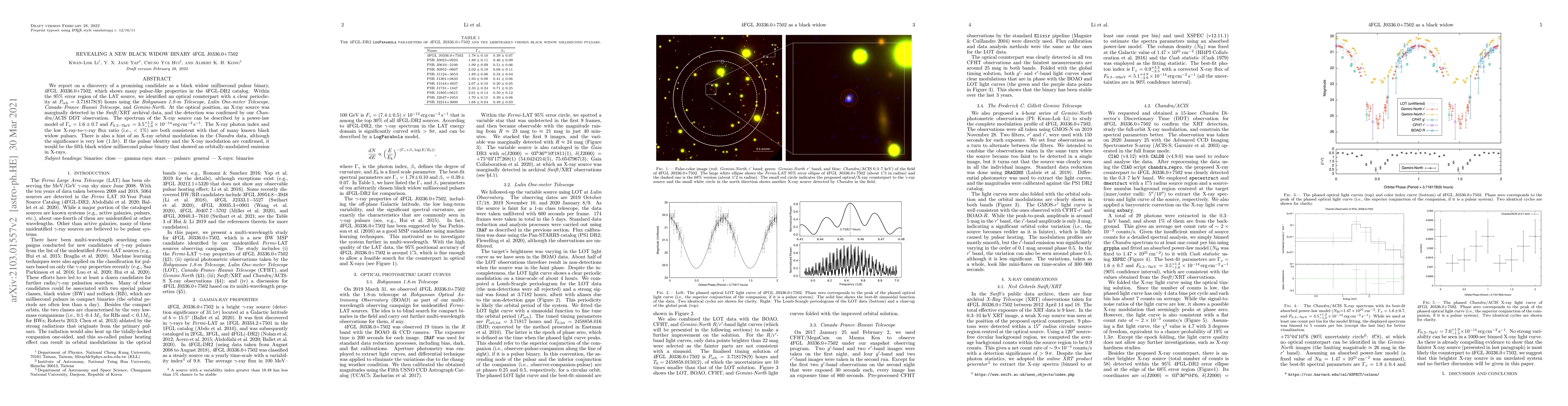 This paper reports the discovery of a candidate black widow millisecond pulsar binary, 4FGL J0336.0+7502, identified through its pulsar-like properties and confirmed with optical periodicity of 3.72 hours. An X-ray source with a power-law spectrum and low flux ratio was found, consistent with known black widow pulsars, suggesting it could be the fifth such system with X-ray orbital modulation.