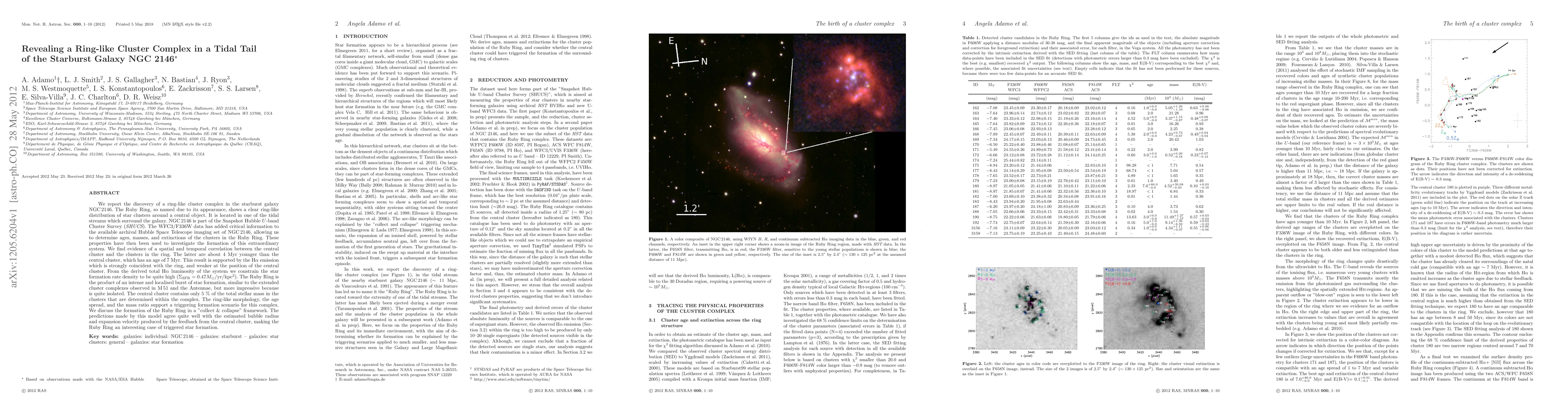 We report the discovery of a ring-like cluster complex in the starburst galaxy NGC 2146. The Ruby Ring, so named due to its appearance, shows a clear ring-like distribution of star clusters around a central object. It is located in one of the tidal streams which surround the galaxy. NGC 2146 is part of the Snapshot Hubble U-band Cluster Survey (SHUCS). The WFC3/F336W data has added critical information to the available archival Hubble Space Telescope imaging set of NGC 2146, allowing us to determine ages, masses, and extinctions of the clusters in the Ruby Ring. These properties have then been used to investigate the formation of this extraordinary system. We find evidence of a spatial and temporal correlation between the central cluster and the clusters in the ring. The latter are about 4 Myr younger than the central cluster, which has an age of 7 Myr. This result is supported by the H alpha emission which is strongly coincident with the ring, and weaker at the position of the central cluster. From the derived total H alpha luminosity of the system we constrain the star formation rate density to be quite high, e.g. ~ 0.47 Msun/yr/kpc^2. The Ruby Ring is the product of an intense and localised burst of star formation, similar to the extended cluster complexes observed in M51 and the Antennae, but more impressive because is quite isolated. The central cluster contains only 5 % of the total stellar mass in the clusters that are determined within the complex. The ring-like morphology, the age spread, and the mass ratio support a triggering formation scenario for this complex. We discuss the formation of the Ruby Ring in a "collect & collapse" framework. The predictions made by this model agree quite well with the estimated bubble radius and expansion velocity produced by the feedback from the central cluster, making the Ruby Ring an interesting case of triggered star formation.