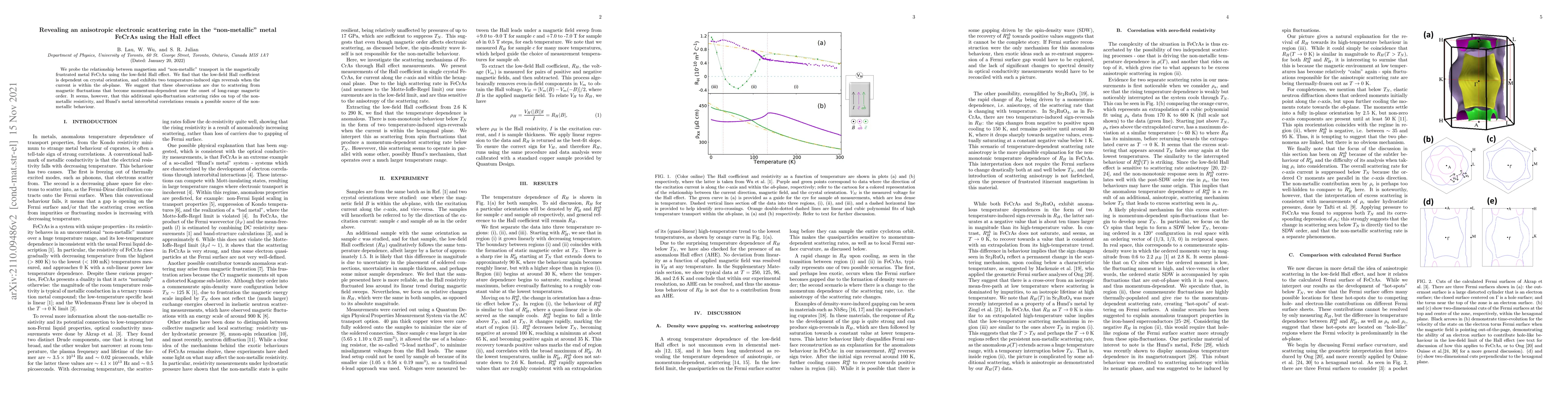 We probe the relationship between magnetism and "non-metallic" transport in the magnetically frustrated metal FeCrAs using the low-field Hall effect. We find that the low-field Hall coefficient is dependent on crystal orientation, and exhibits two temperature-induced sign reversals when the current is within the $ab$-plane. We suggest that these observations are due to scattering from magnetic fluctuations that become momentum-dependent near the onset of long-range magnetic order. It seems, however, that this additional spin-fluctuation scattering rides on top of the non-metallic resistivity, and Hund's metal interorbital correlations remain a possible source of the non-metallic behaviour.