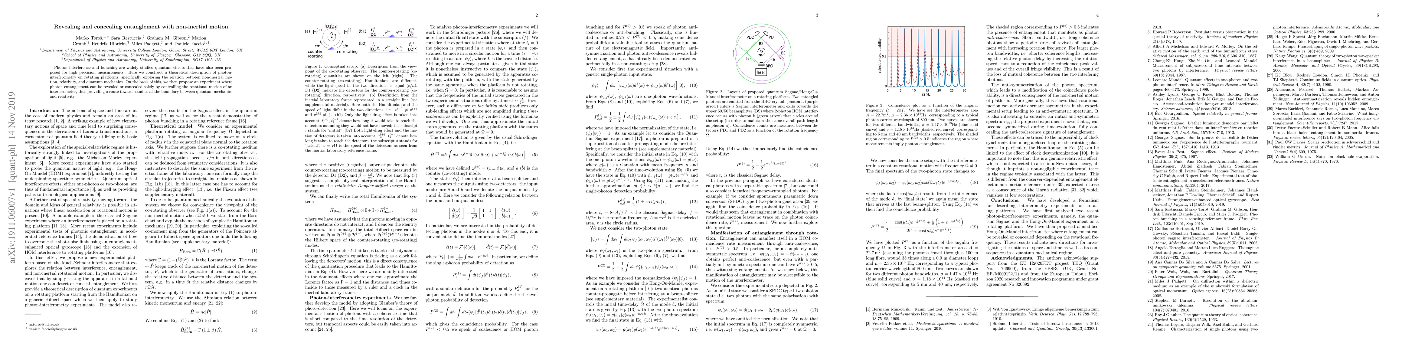 Photon interference and bunching are widely studied quantum effects that have also been proposed for high precision measurements. Here we construct a theoretical description of photon-interferometry on rotating platforms, specifically exploring the relation between non-inertial motion, relativity, and quantum mechanics. On the basis of this, we then propose an experiment where photon entanglement can be revealed or concealed solely by controlling the rotational motion of an interferometer, thus providing a route towards studies at the boundary between quantum mechanics and relativity.