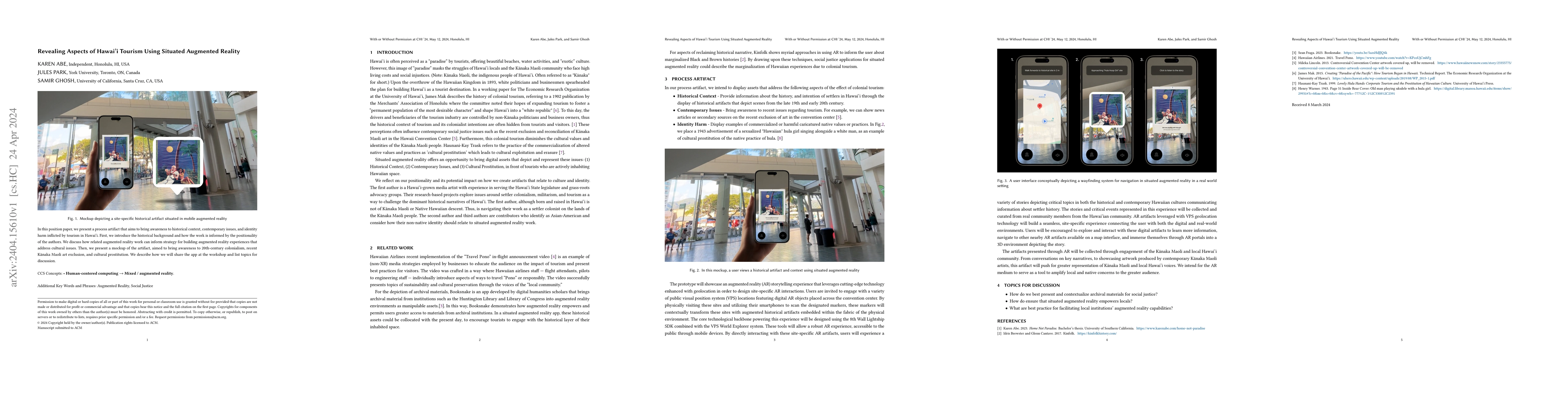 This paper proposes an augmented reality artifact to highlight historical and contemporary issues in Hawai'i tourism, focusing on colonialism, Kanaka Maoli art exclusion, and cultural prostitution. The artifact aims to foster awareness and discussion on these cultural concerns.