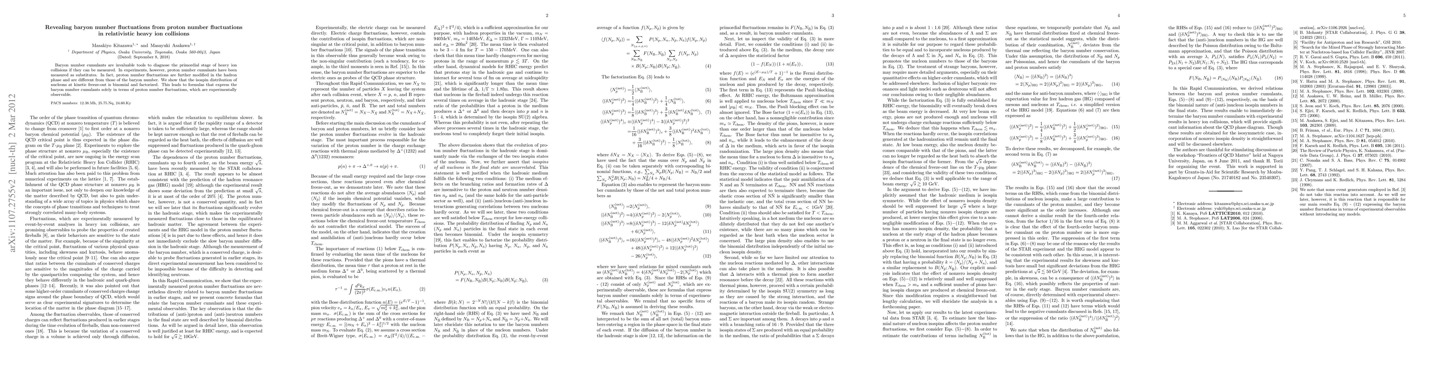 Baryon number cumulants are invaluable tools to diagnose the primordial stage of heavy ion collisions if they can be measured. In experiments, however, proton number cumulants have been measured as substitutes. In fact, proton number fluctuations are further modified in the hadron phase and different from those of baryon number. We show that the isospin distribution of nucleons at kinetic freezeout is binomial and factorized. This leads to formulas that express the baryon number cumulants sorely in terms of proron number fluctuations, which are experimentally observable.