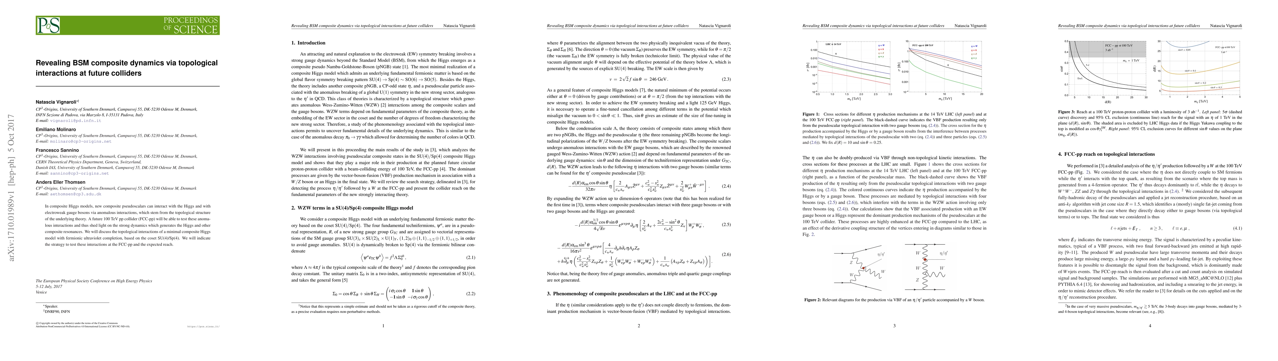 In composite Higgs models, new composite pseudoscalars can interact with the Higgs and with electroweak gauge bosons via anomalous interactions, which stem from the topological structure of the underlying theory. A future 100 TeV pp collider (FCC-pp) will be able to test these anomalous interactions and thus shed light on the strong dynamics which generates the Higgs and other composite resonances. We will discuss the topological interactions of a minimal composite Higgs model with fermionic ultraviolet completion, based on the coset SU(4)/Sp(4). We will indicate the strategy to test these interactions at the FCC-pp and the expected reach.