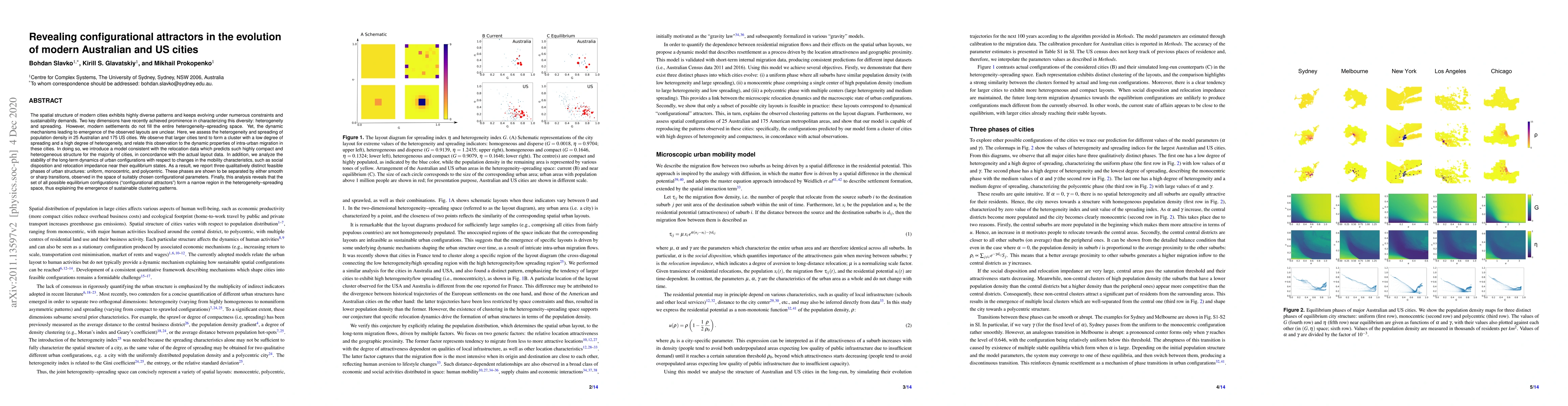 The spatial structure of modern cities exhibits highly diverse patterns and keeps evolving under numerous constraints. Two key dimensions have recently achieved prominence in characterizing this diversity: heterogeneity and spreading. However, modern settlements do not fill the entire heterogeneity--spreading space. Yet, the dynamic mechanisms leading to emergence of the observed layouts are unclear. Here, we assess the heterogeneity and spreading of population density in 25 Australian and 175 US cities. We observe that larger cities tend to form a cluster with a low degree of spreading and a high degree of heterogeneity, and relate this observation to the dynamic properties of intra-urban migration in these cities. In doing so, we introduce a model consistent with the relocation data which predicts such highly compact and heterogeneous structure for the majority of cities, in concordance with the actual layout data. In addition, we analyze the stability of the long-term dynamics of urban configurations with respect to changes in the mobility characteristics, such as social disposition and relocation impedance near their equilibrium states. As a result, we report three qualitatively distinct feasible phases of urban structures: uniform, monocentric, and polycentric. These phases are shown to be separated by either smooth or sharp transitions, observed in the space of suitably chosen configurational parameters. Finally, this analysis reveals that the set of all possible equilibrium configurations ("configurational attractors") form a narrow region in the heterogeneity--spreading space, thus explaining the emergence of clustering patterns.